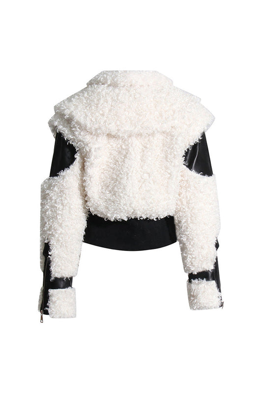 Street Leather Panel High Neck Zip Up Faux Shearling Bomber Jacket
