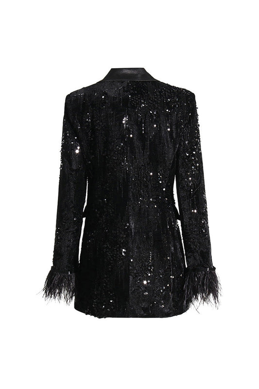 Silky Satin Lapel Feather Trim Long Sleeve Cinch Waist Sequin Party Blazer