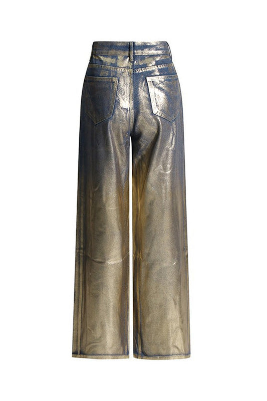 Unique Metallic Foil Coated Blue and Gold High Waist Wide Leg Baggy Jeans