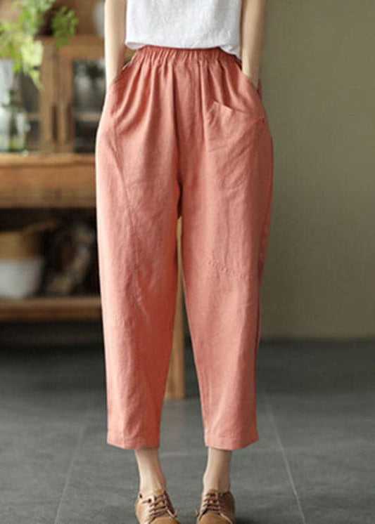 Bohemian Pink Elastic Waist Pockets Linen Crop Pants Summer