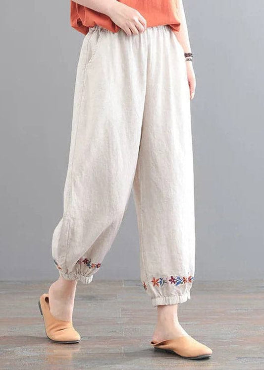 Organic Beige Embroideried Floral Pockets Crop Pants Summer