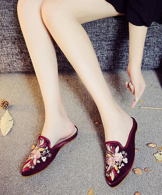 Black Embroideried Cotton Fabric Women Pointed Toe Slide Sandals