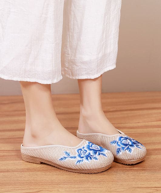 Beige Embroideried Linen Fabric Slippers Shoes Splicing