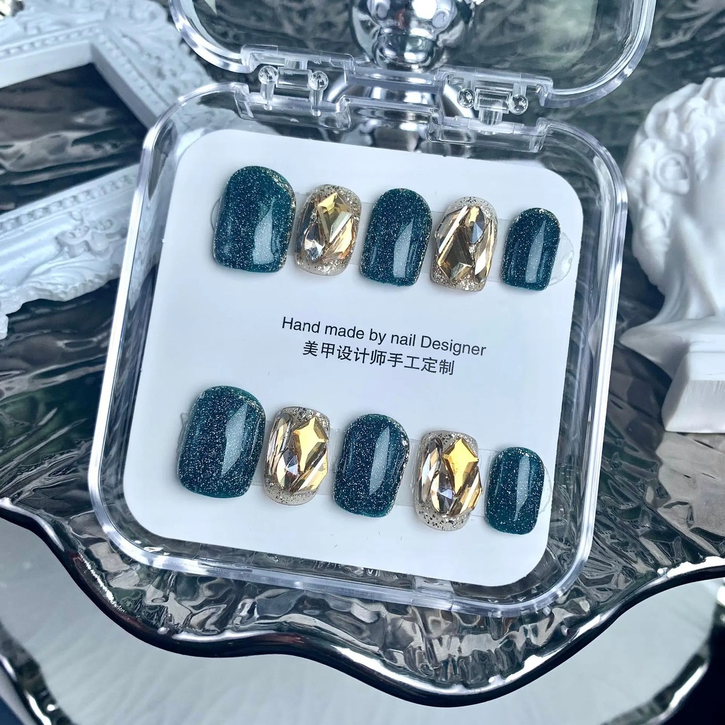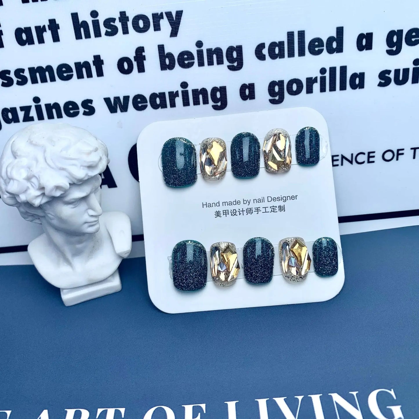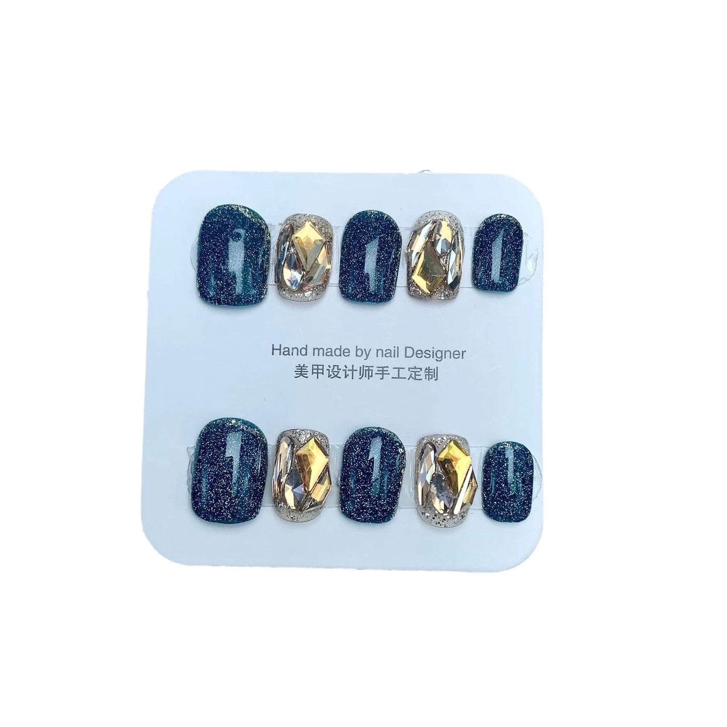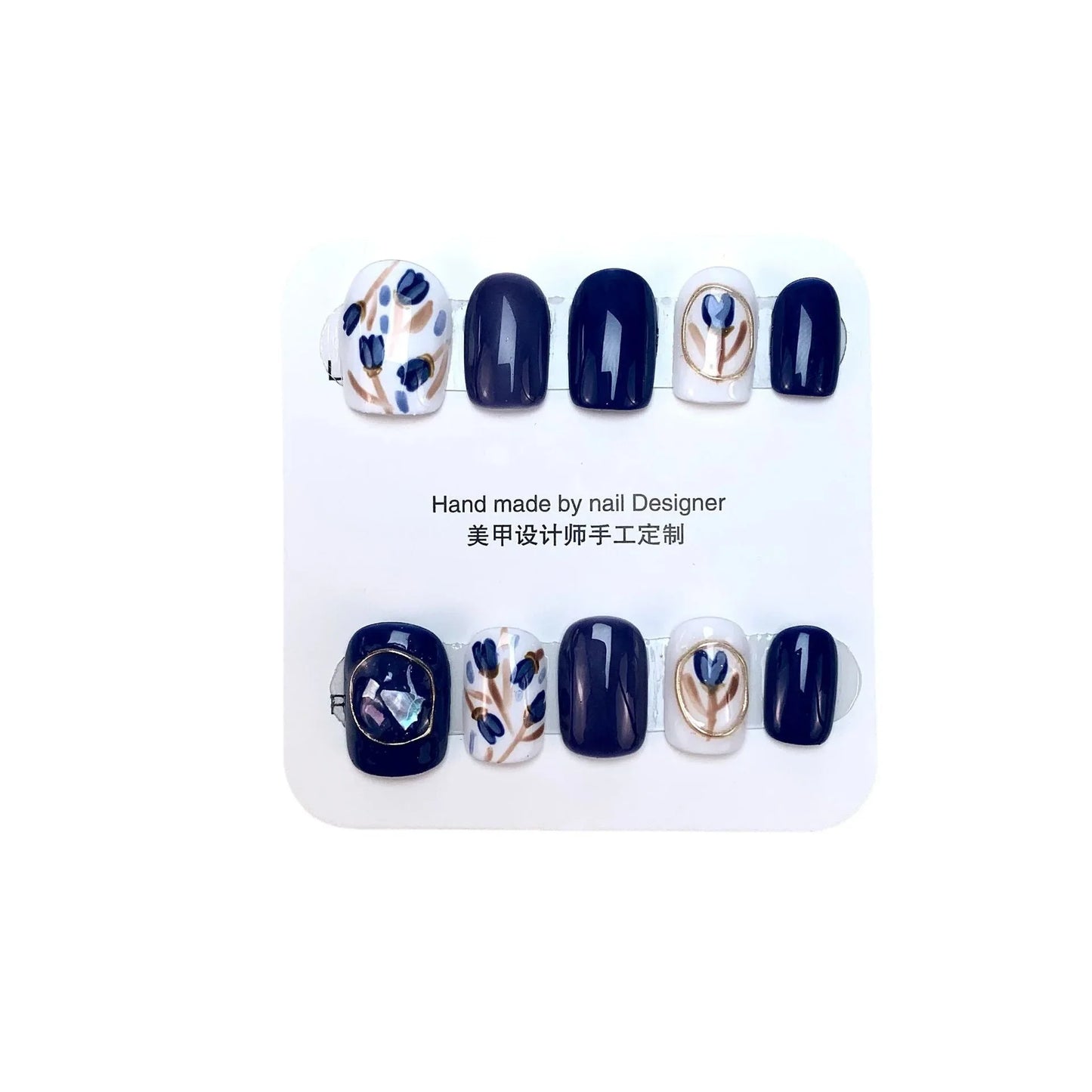 10PCS Blue & White Handmade Porcelain Short Square Nail Tips Chinese Rose Stars False Nails Press On Nail Art Reusable Fake Nail