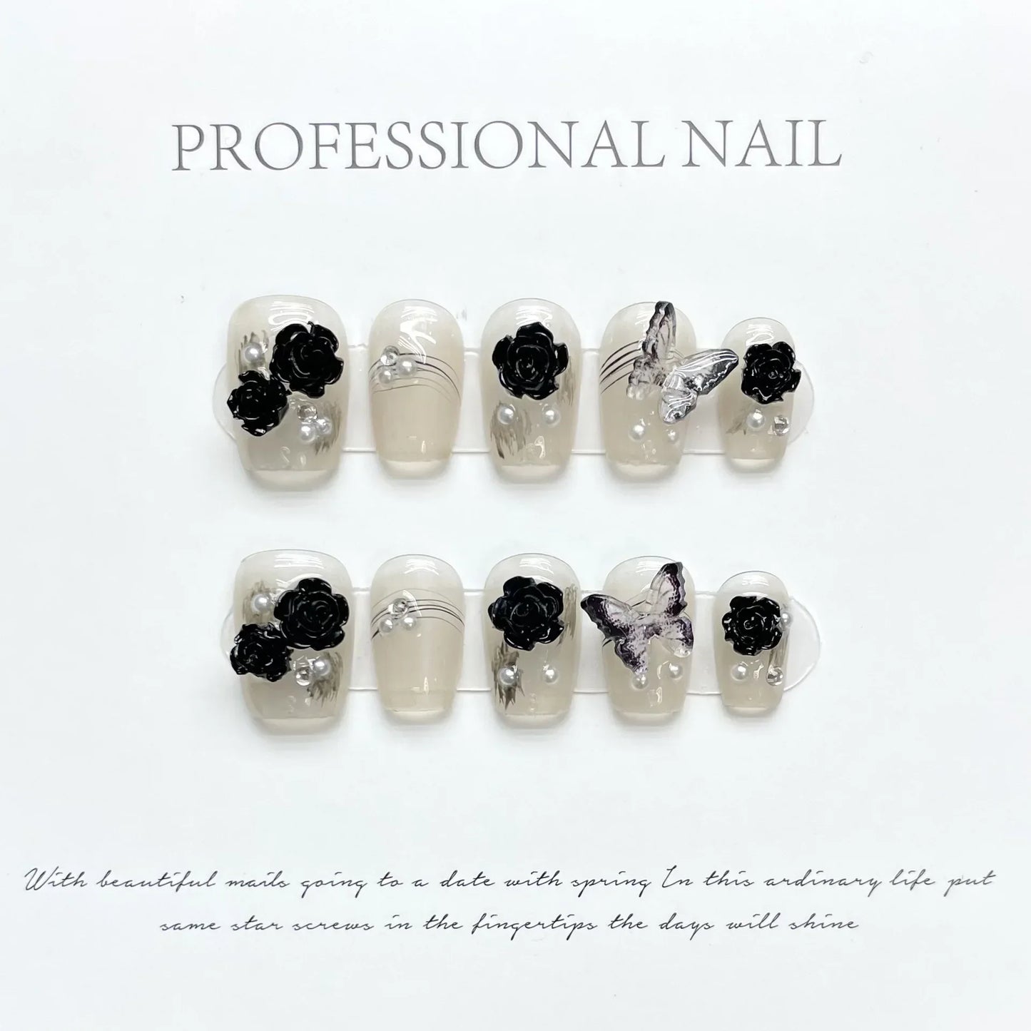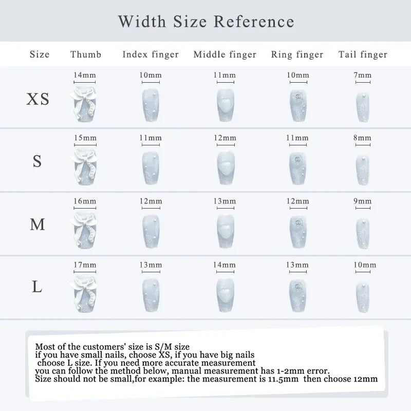 ・10pcs * handmade fake Press on nails(Nail size selection: Generally select XS size for small nails,S size and M size for normal fingers, and L size for large nails. If you want a standard point, please measure it according to the method we provide. Size should not be small,for example: the measurement is 11.5mm then choose 12mm)