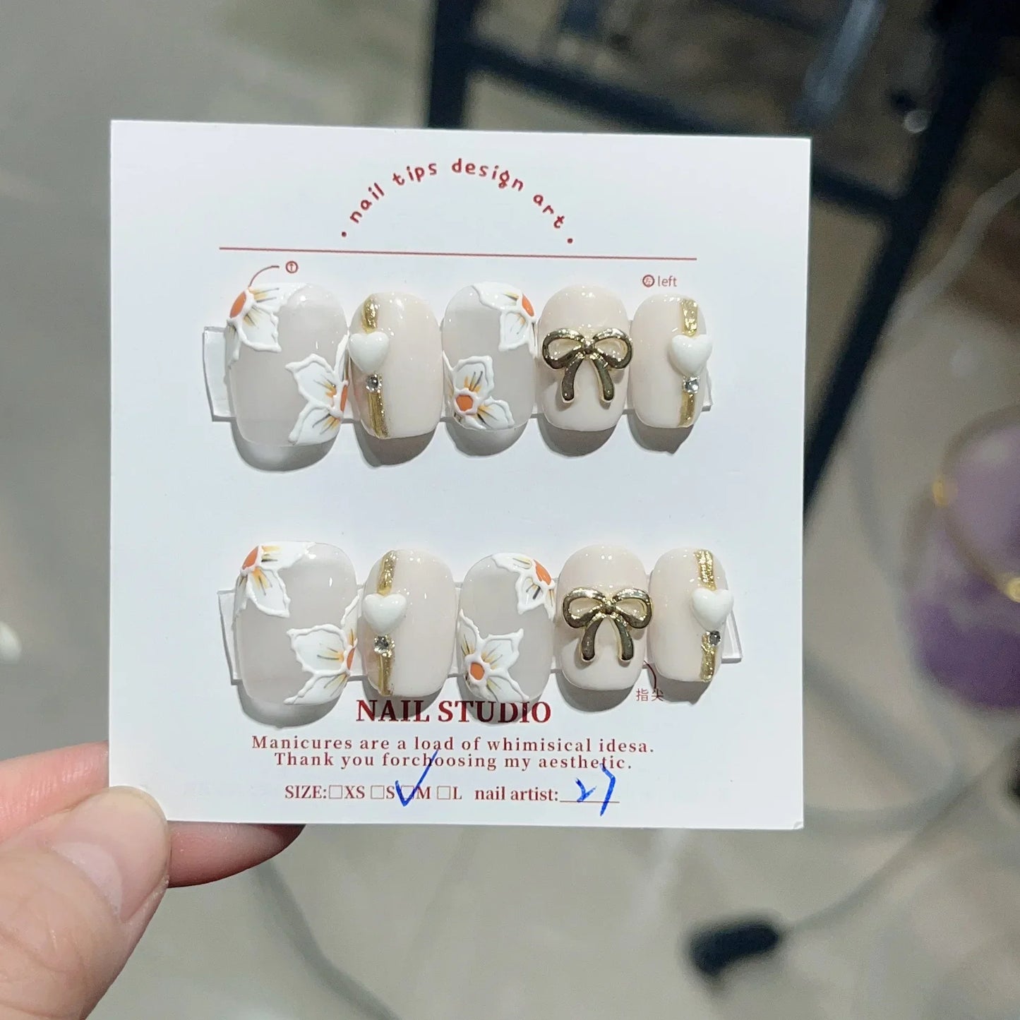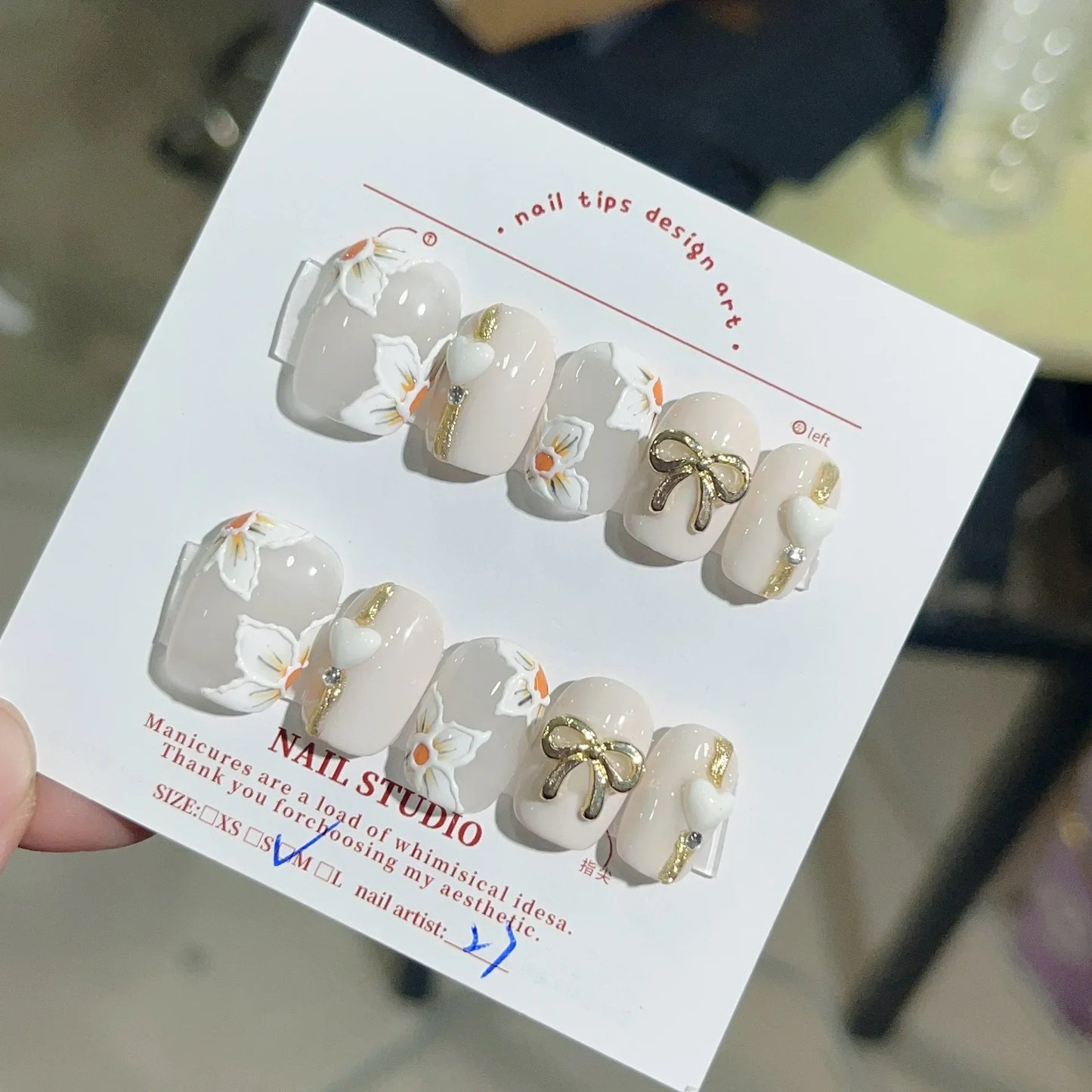 10PCS handmade acrylic ballet white artificial nails with flower designs square head press on nails short full cover fake nails