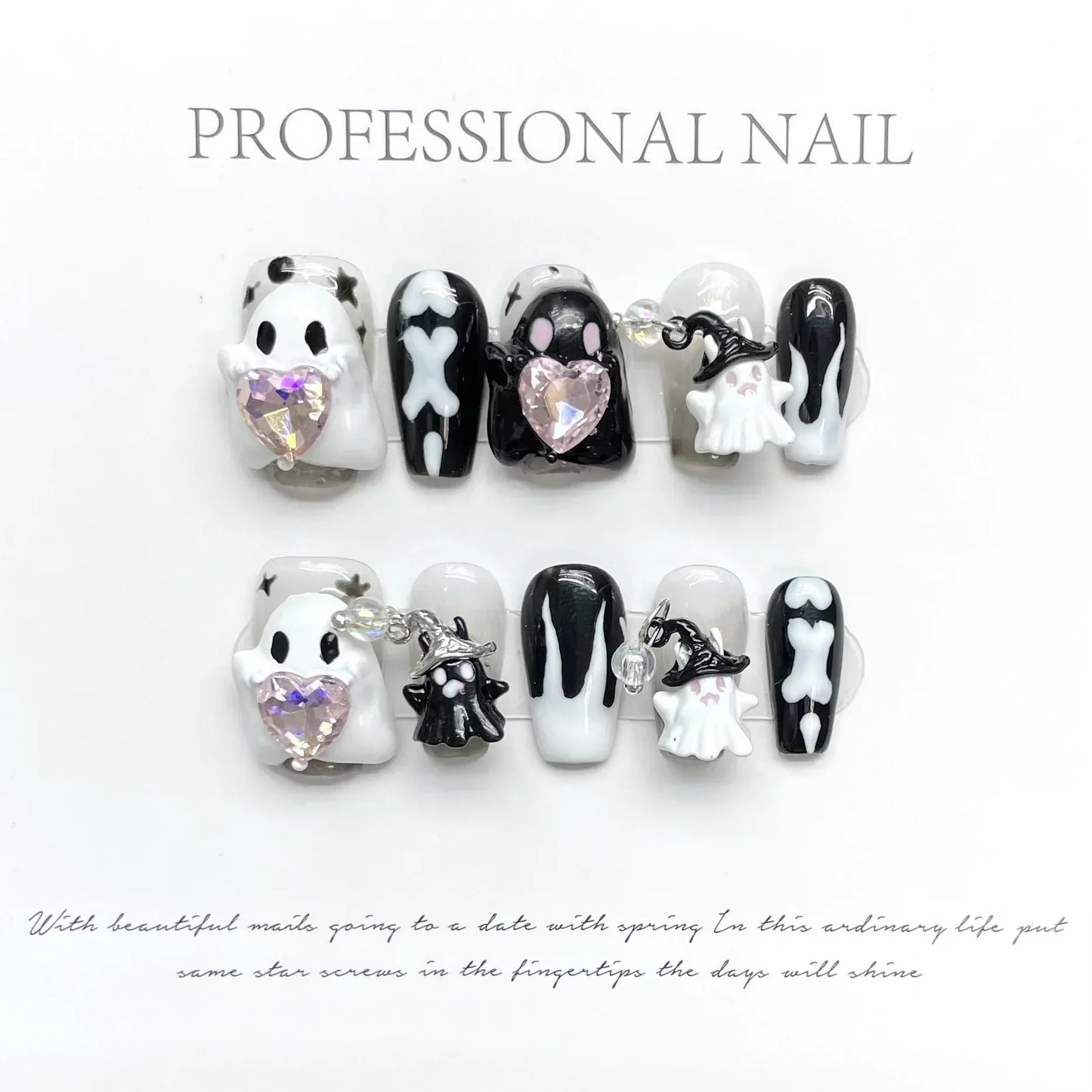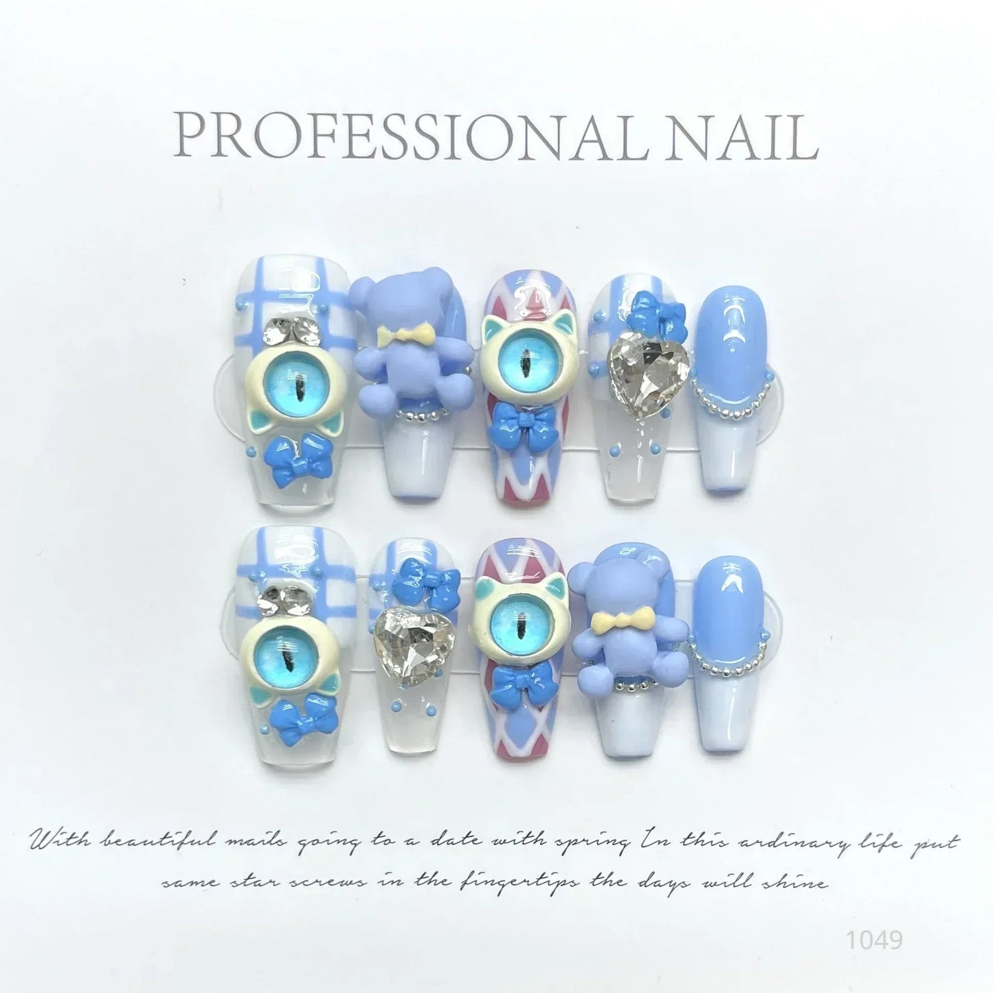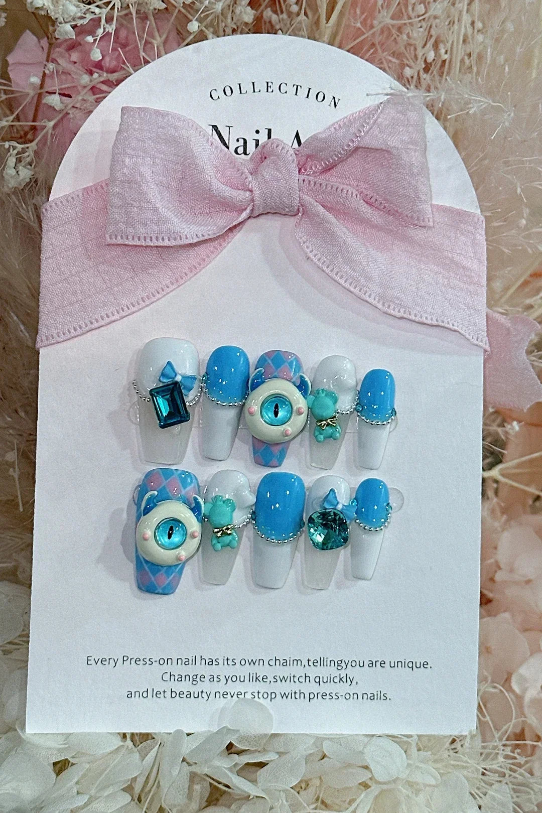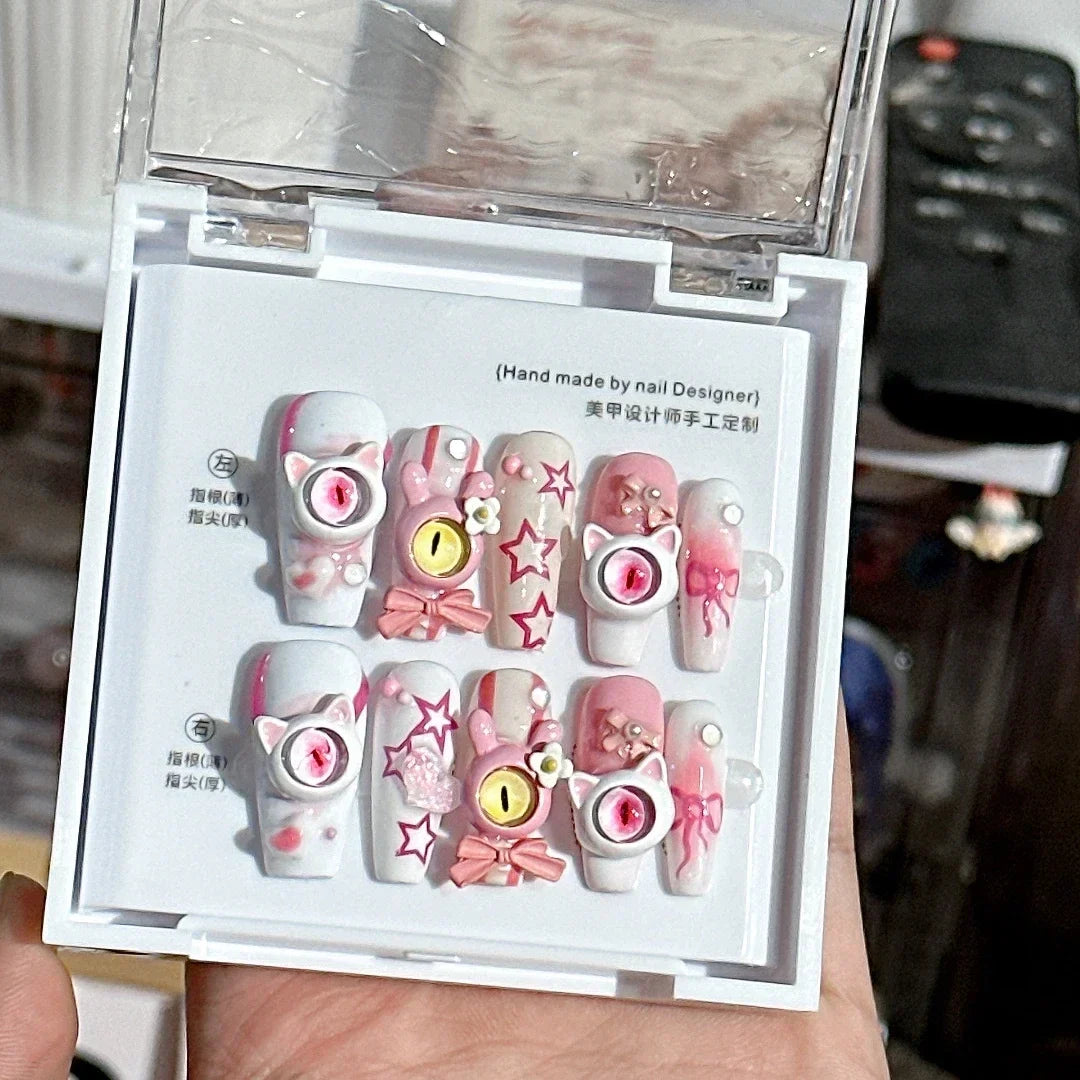 10Pcs Handmade Press On Nails with Eye Little Monster Design Wearable Manicure False Nails Decoration Full Cover Nail Tips Art