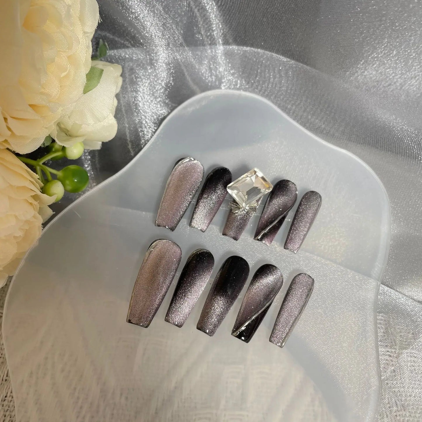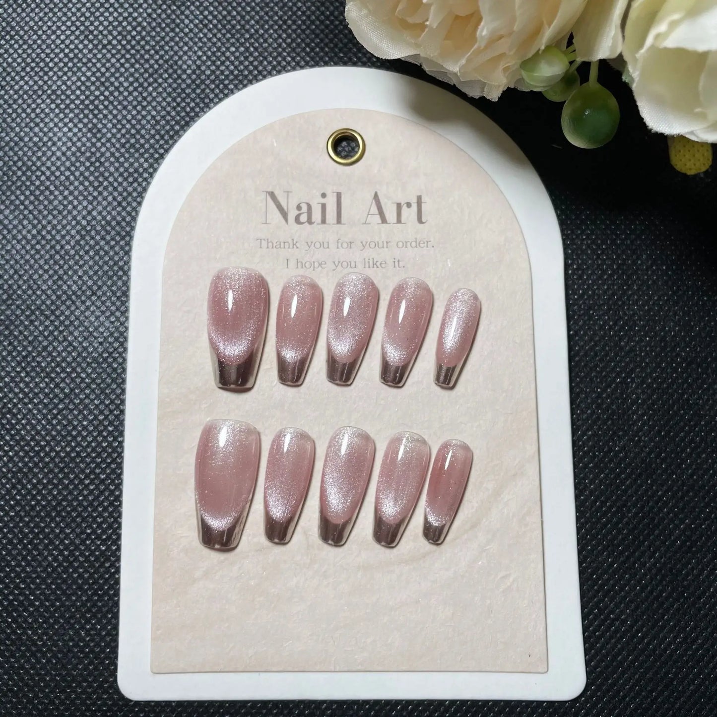 10pcs Handmade short french artificial nails cat eyes shiny rhinestones full cover press on nails ballet false nails with glue