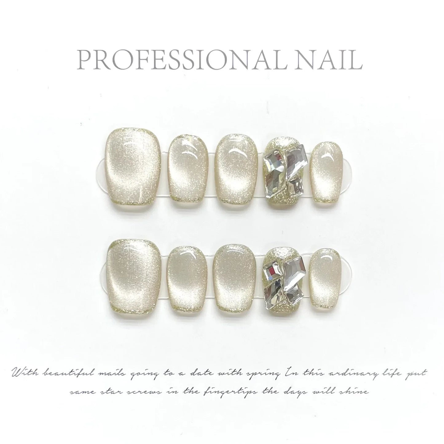 10Pcs Short Ballet Handmade Cat Eye Press on Nails Wearable Rhinestones French False Nails Glitter Decoration Nail Tips Art