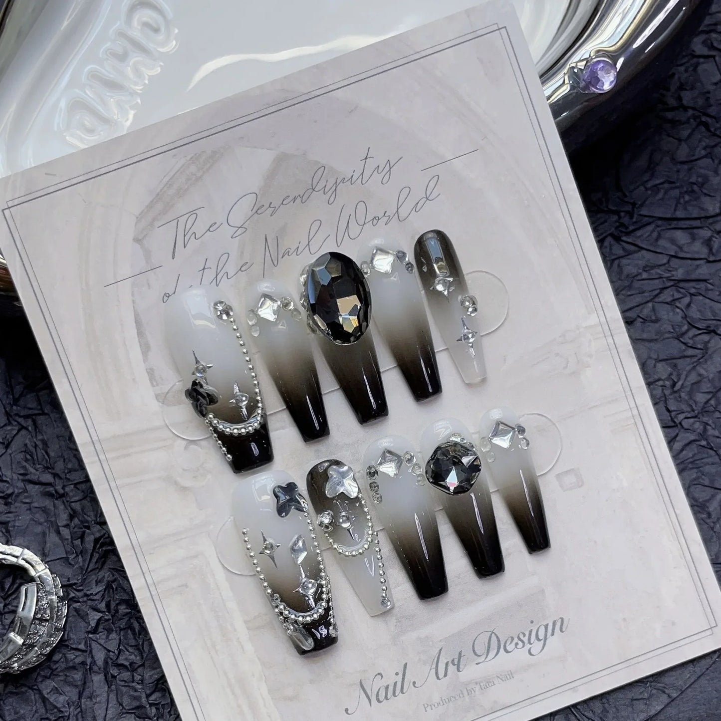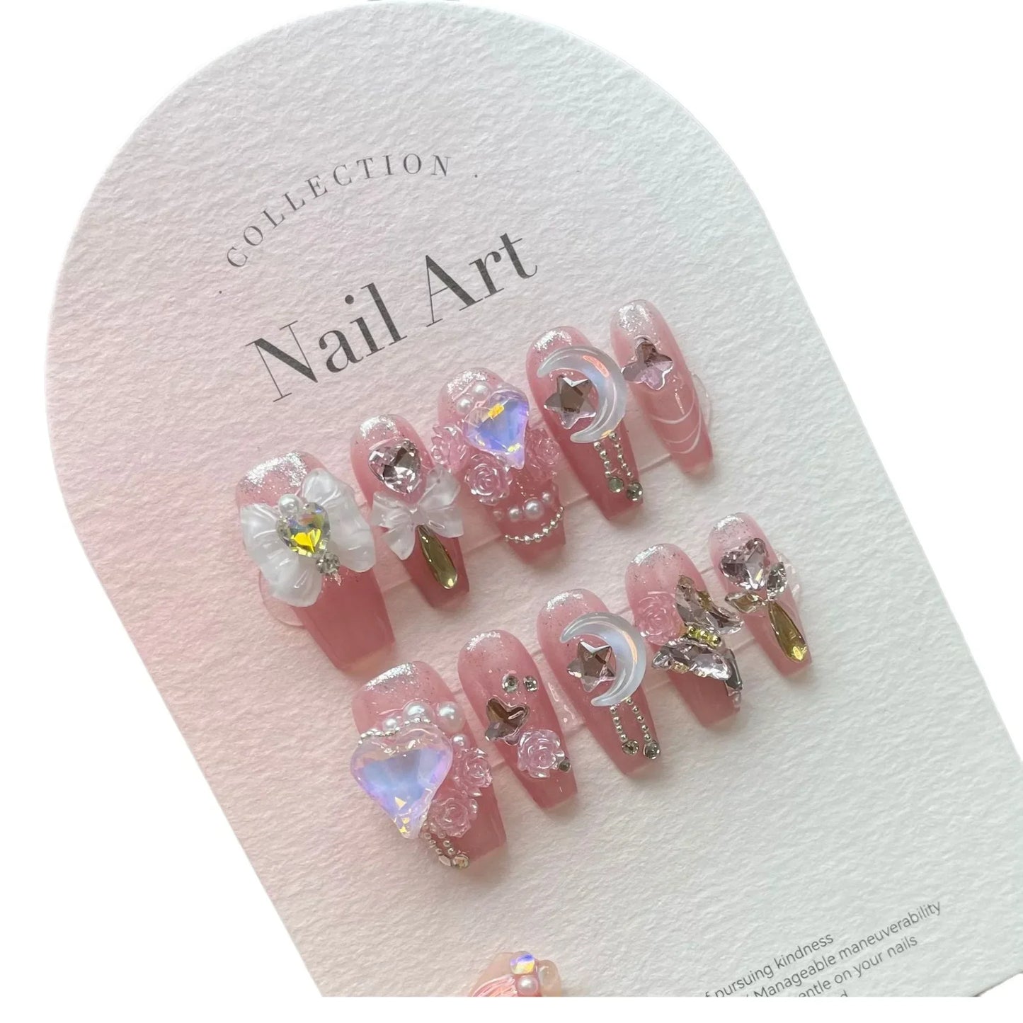 10Pcs Sweet Pink Handmade Press On Nails Ballerina Japanise with Rhinestones Wearable False Nails Decoration Fake Nails Tips Art
