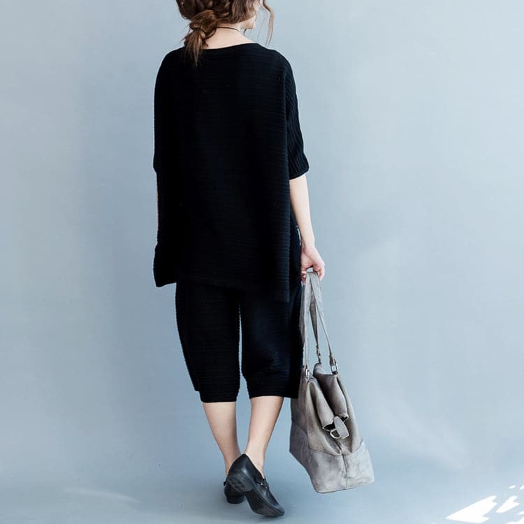 Stylish black cotton thin sweaters and casual wide leg pants knit two pieces