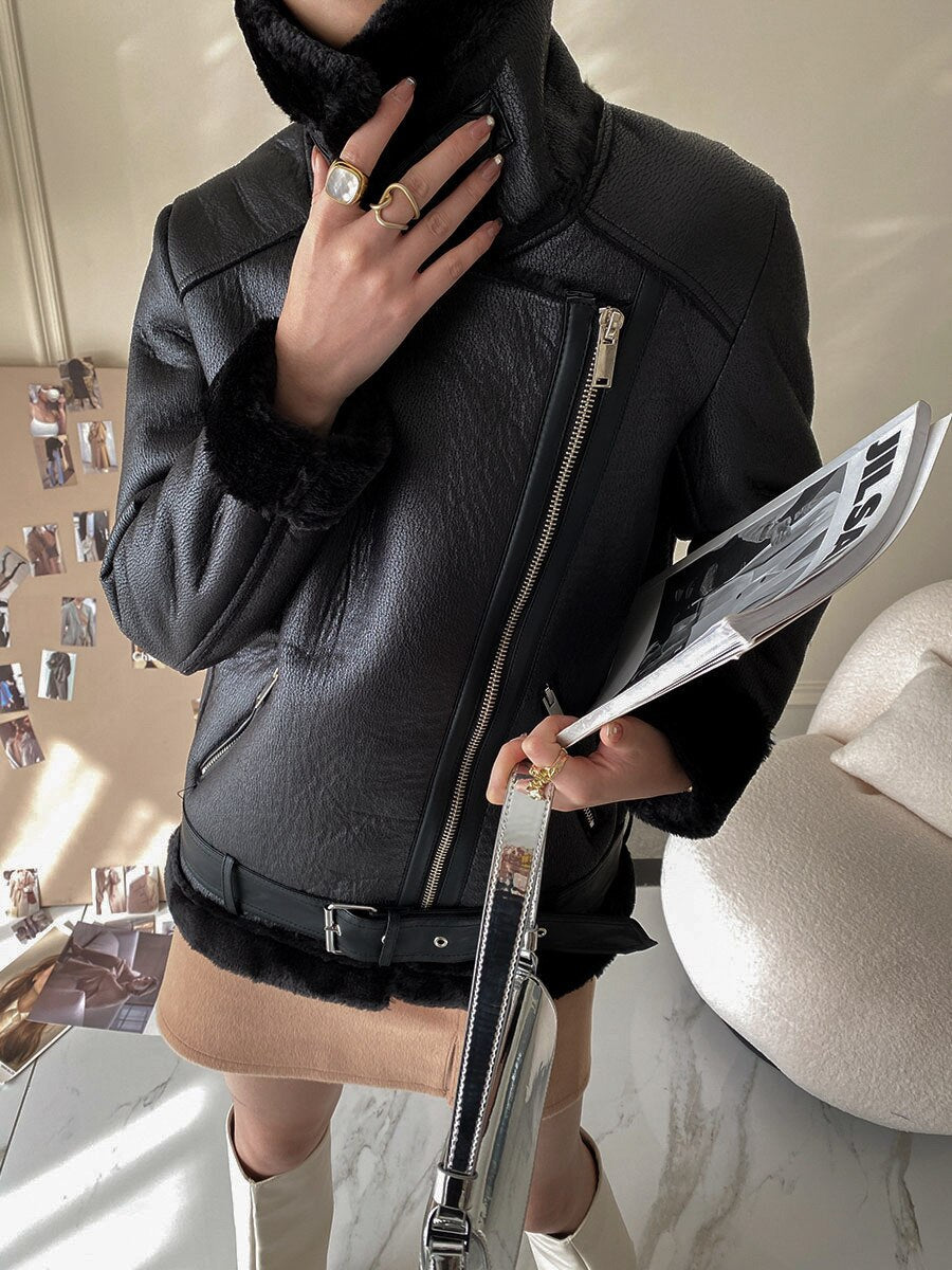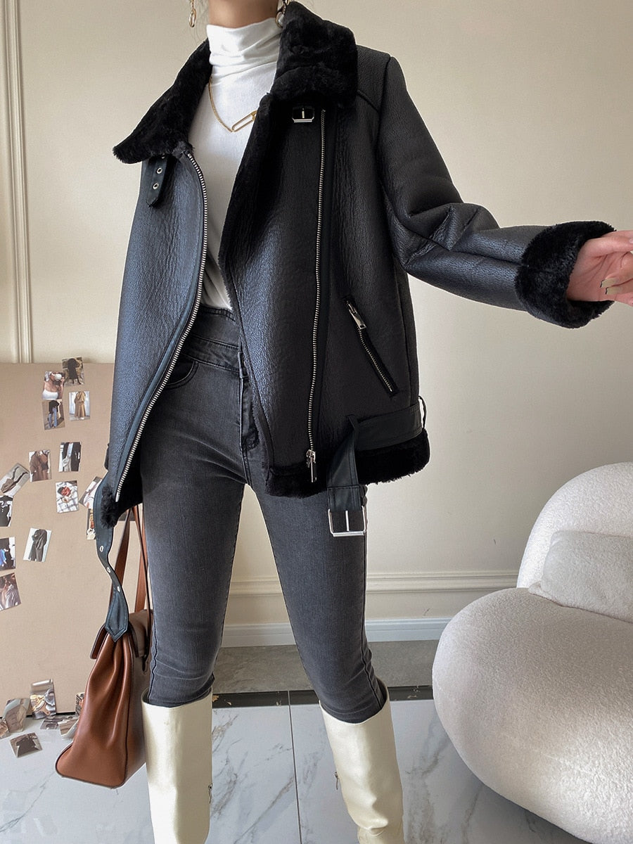 New Women's Warm Thickened Jacket Medium Long Motorcycle Coat Handsome High end Leather Jacket Lamb Hair