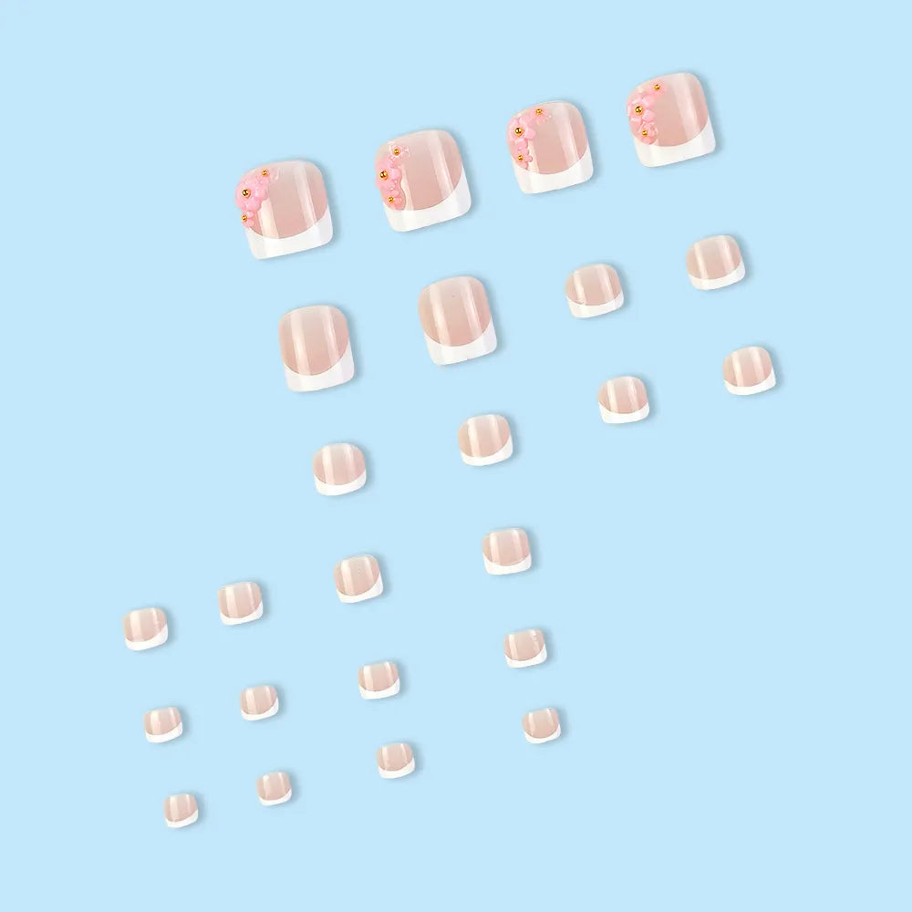 24pcs French White Fake Toenail Patch with Flower Rhinestone Design Artificial Toe Nail Tips for Women Lady Summer DIY Nails