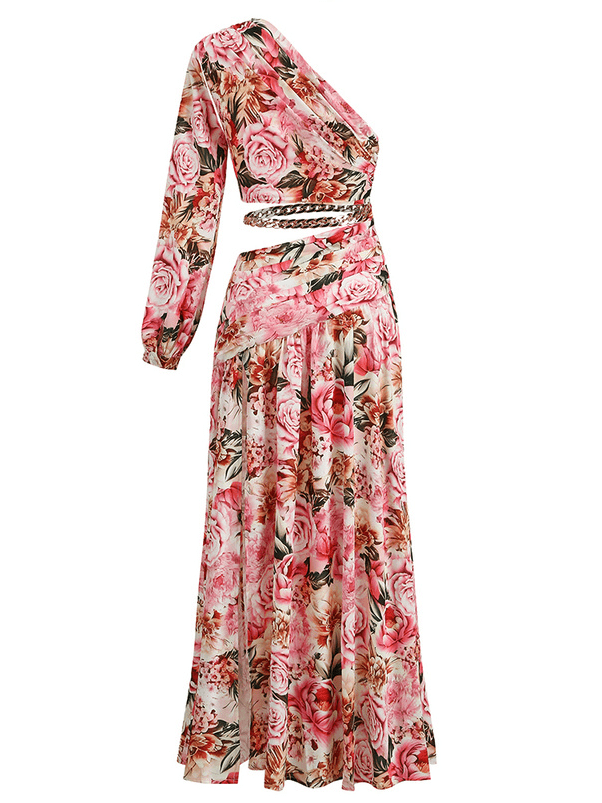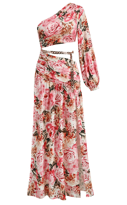 Give your wardrobe some floral feels with this Asymmetrical Red Floral Maxi Dress, perfect for all those special occasions you’ve got in your diary. Featuring an asymmetric one-shoulder neckline, a blouson sleeve and a cut-out at the waist with a chain detail. Style with strappy heels and a mini bag for a look that everyone will love.