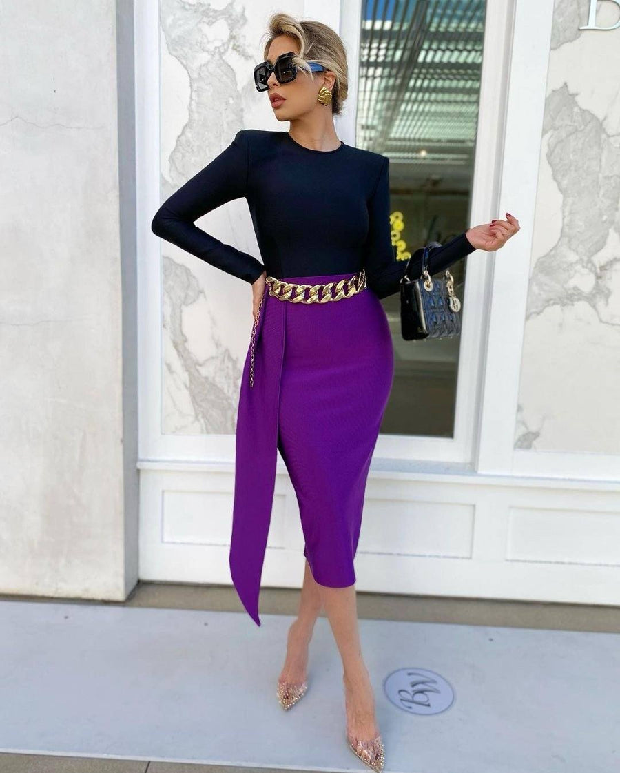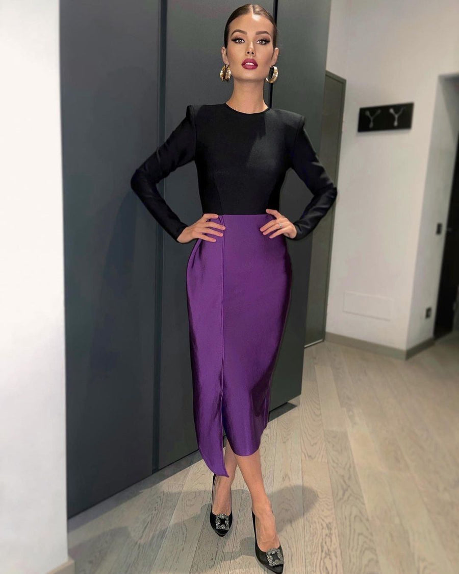 Add some colour to your wardrobe with our Black and Purple Bodycon Midi Dress! Featuring a body-hugging design with long sleeves. Hidden zipper at the back. Style with heels and a mini bag for a look we're loving!