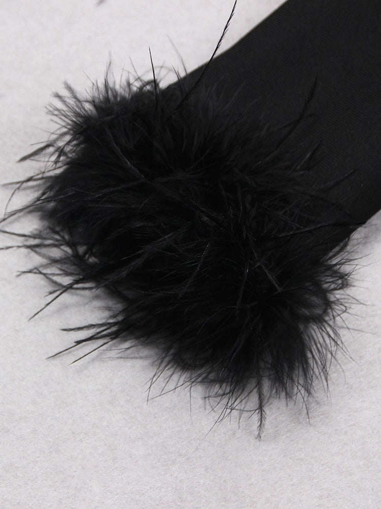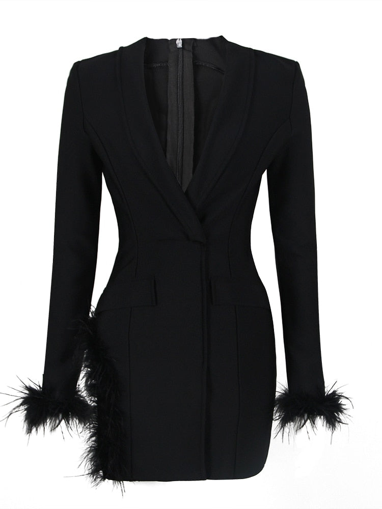 Stand out from the crowd in the Black Blazer Dress with Feathers! Featuring a collared neckline, feather sleeve detail, and a thigh-high feather split. V-neck. Hidden zipper at the back. Style with heels and a clutch bag.