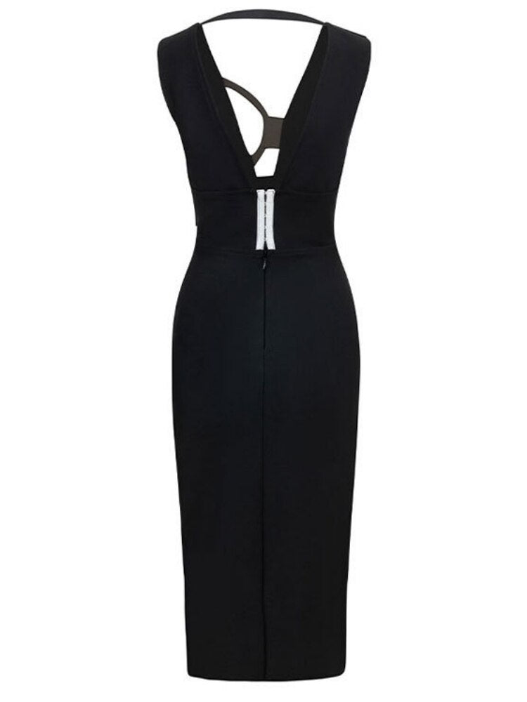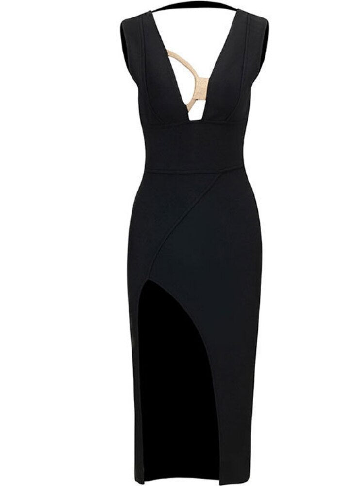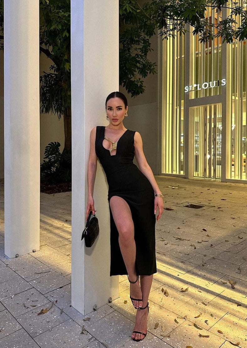 Black Slit Midi Dress with Deep Neckline