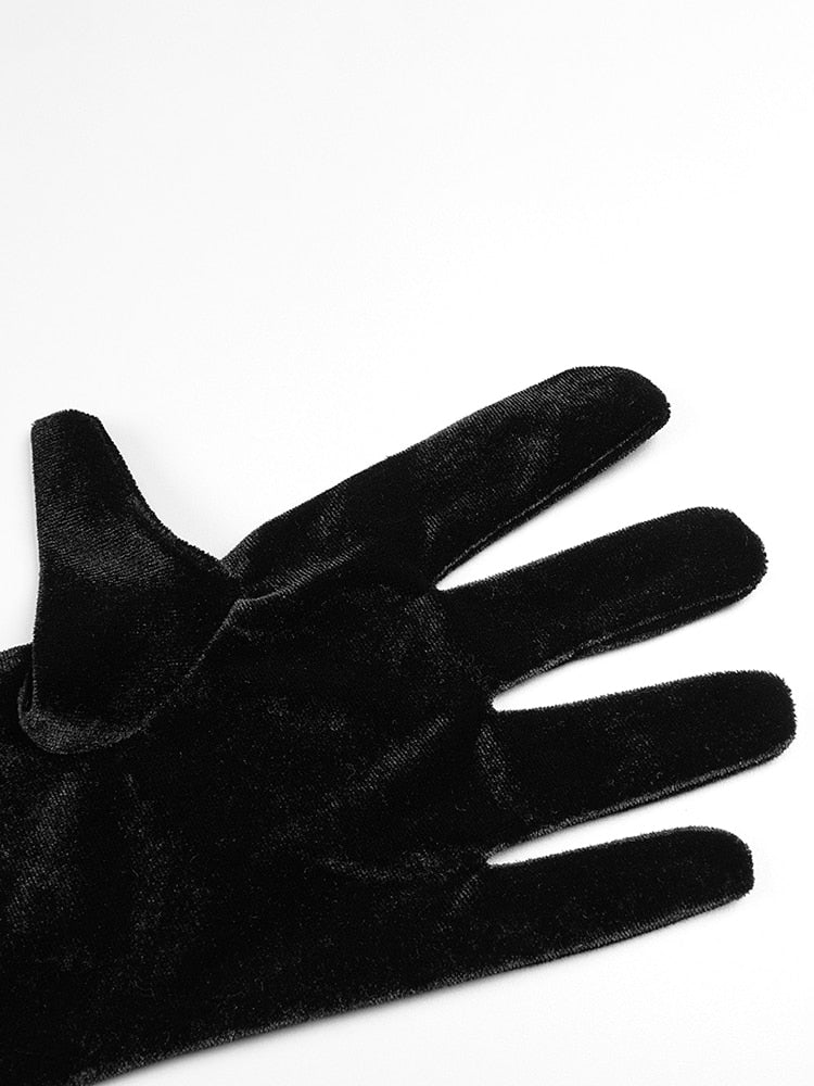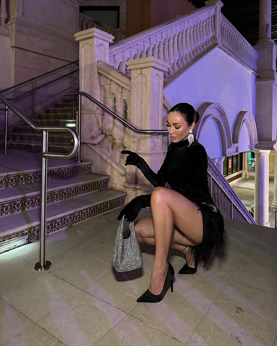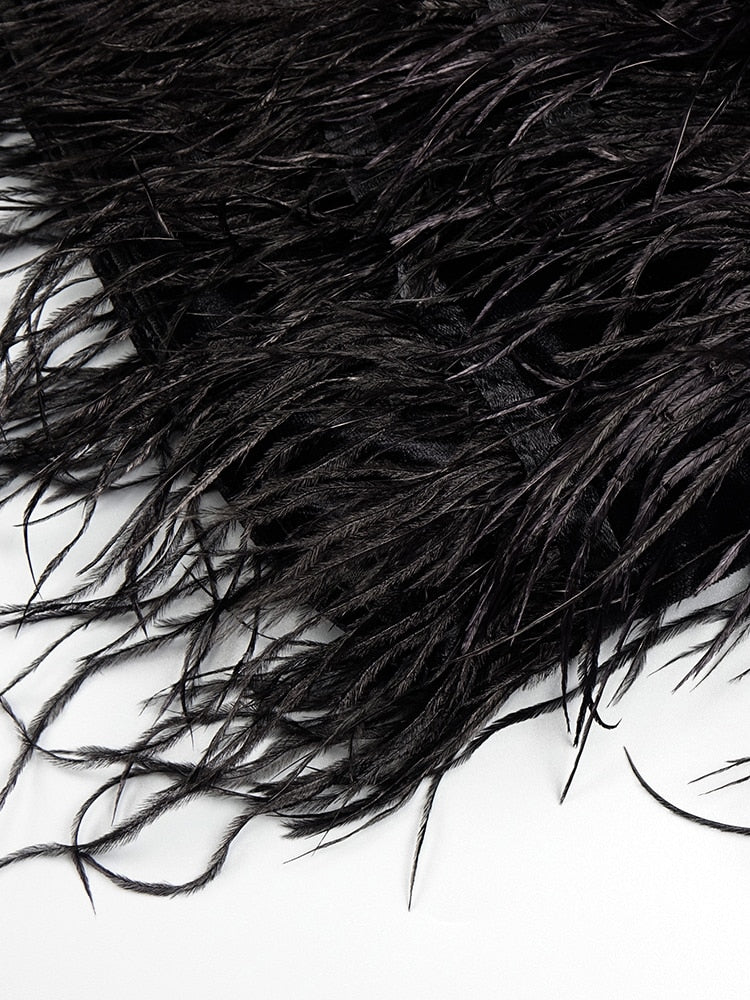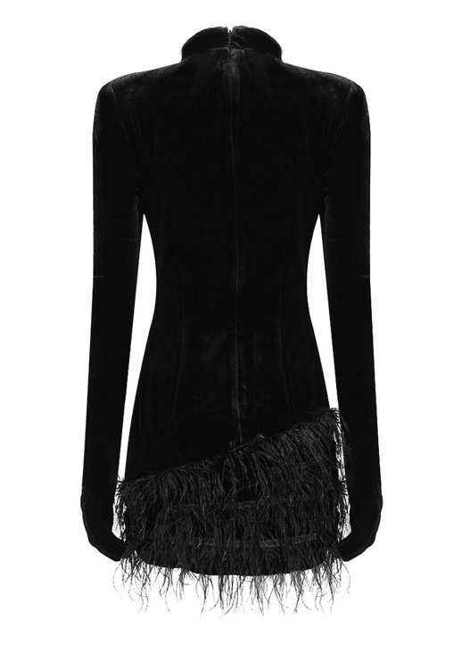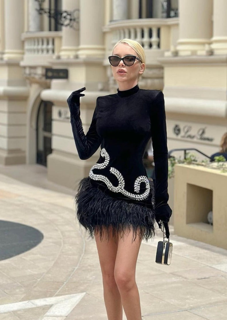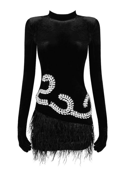 The Black Velvet Mini Dress with Glove Sleeves is a chic take on a timeless classic. Crafted with luxurious black fabric, this dress features full sleeves with built-in gloves, padded shoulders and rhinestone detail for a glamorous finish. Feathers cascade romantically from the hemline, adding a delicate touch to this sophisticated piece. Perfect for a night of elegance.
