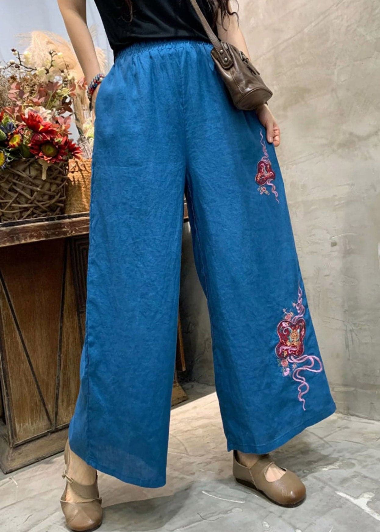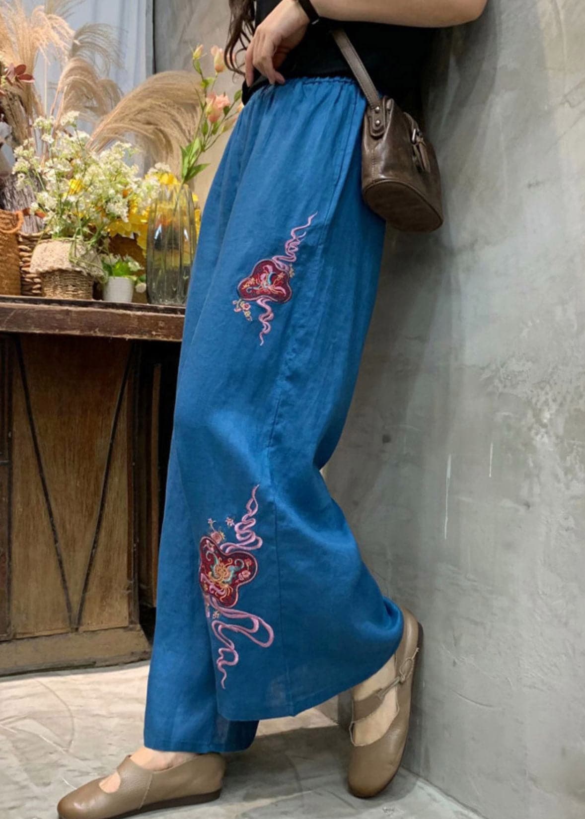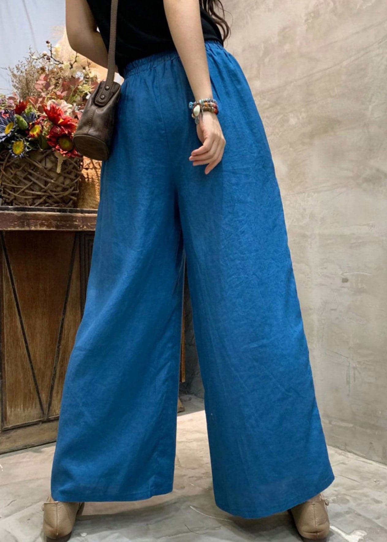 Blue Loose Linen Wide Leg Pants elastic waist Summer