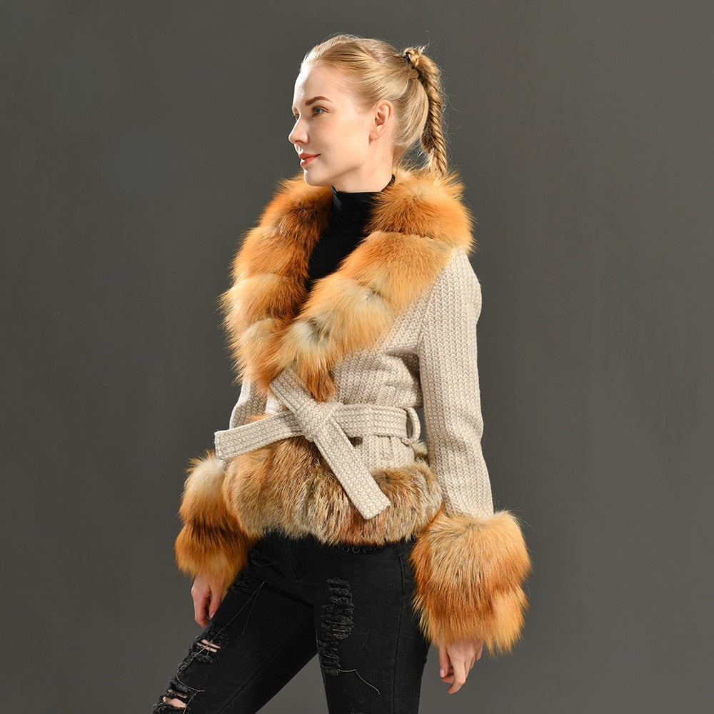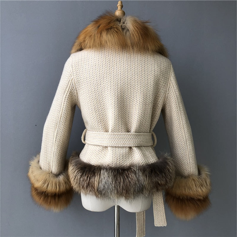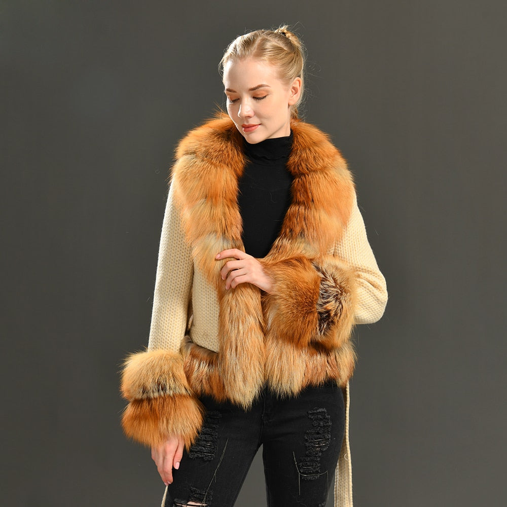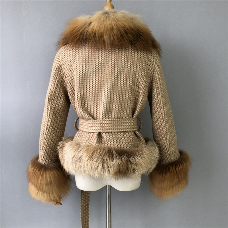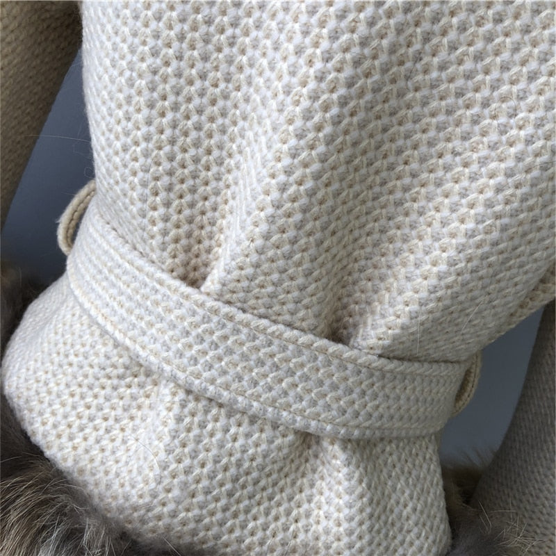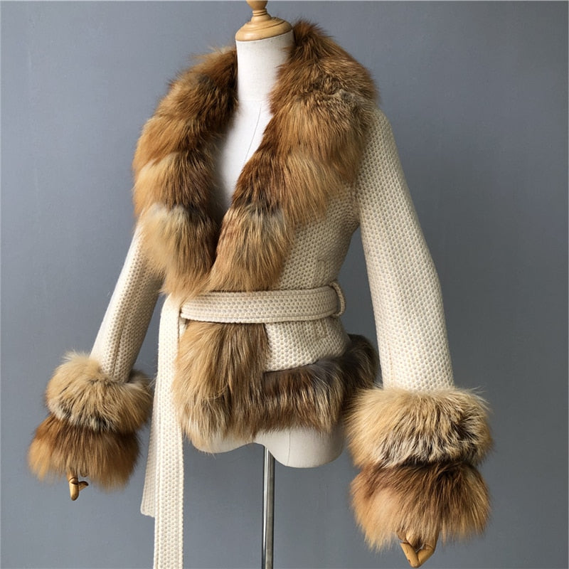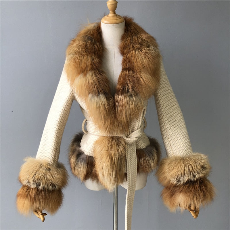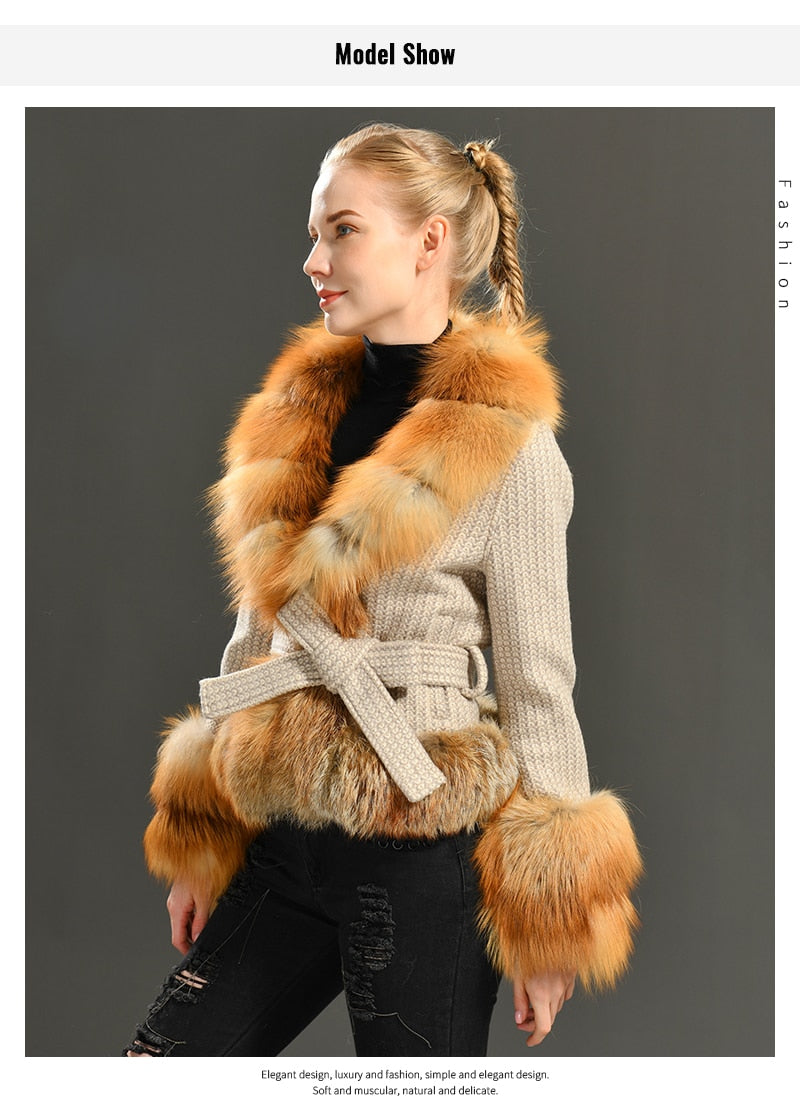 Natural Fur Collar Outerwear Luxury Thick Warm Short Jacket with Belt