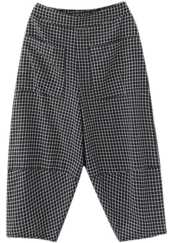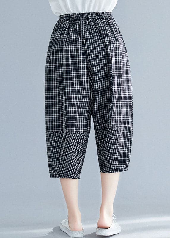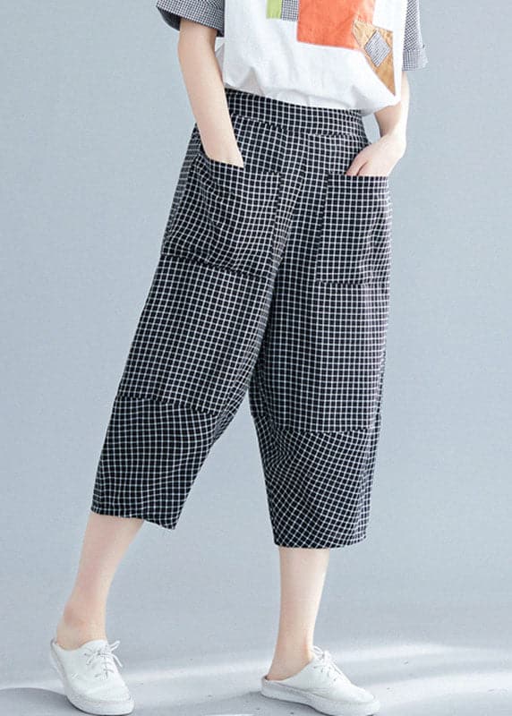 Casual Black Plaid Elastic Waist Pockets Cotton Crop Pants Trousers Summer