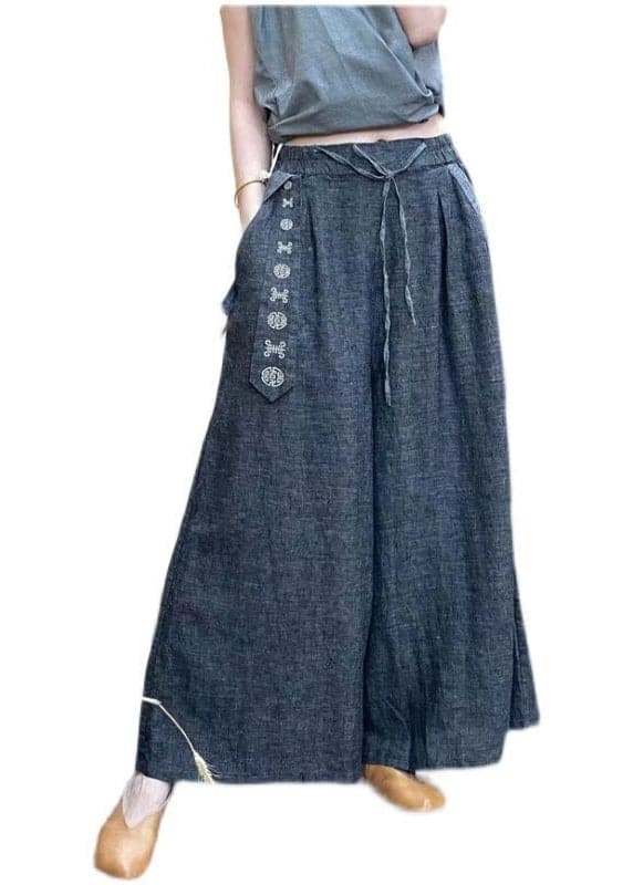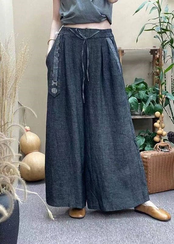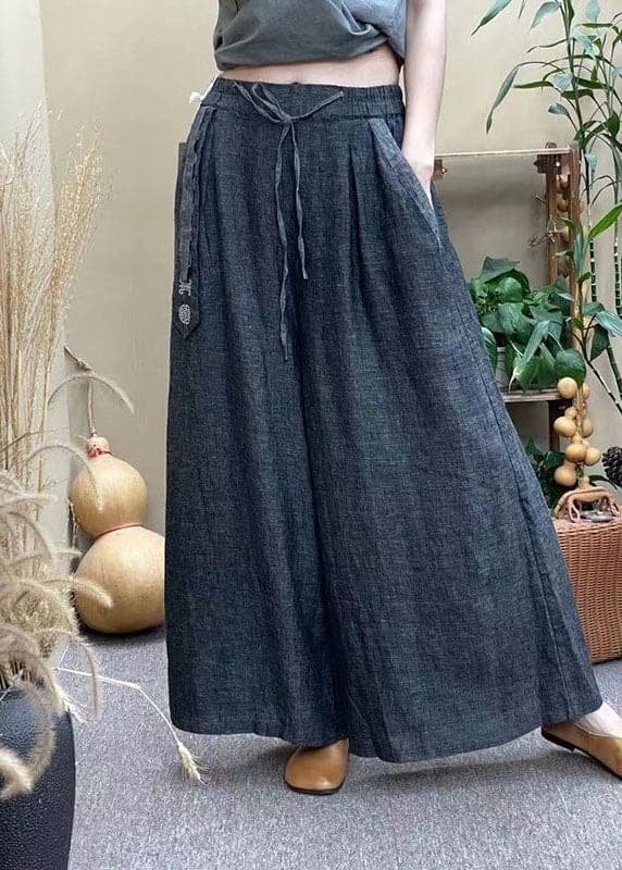 Casual Grey Elastic Waist Drawstring Pockets Linen Wide Leg Pants Summer