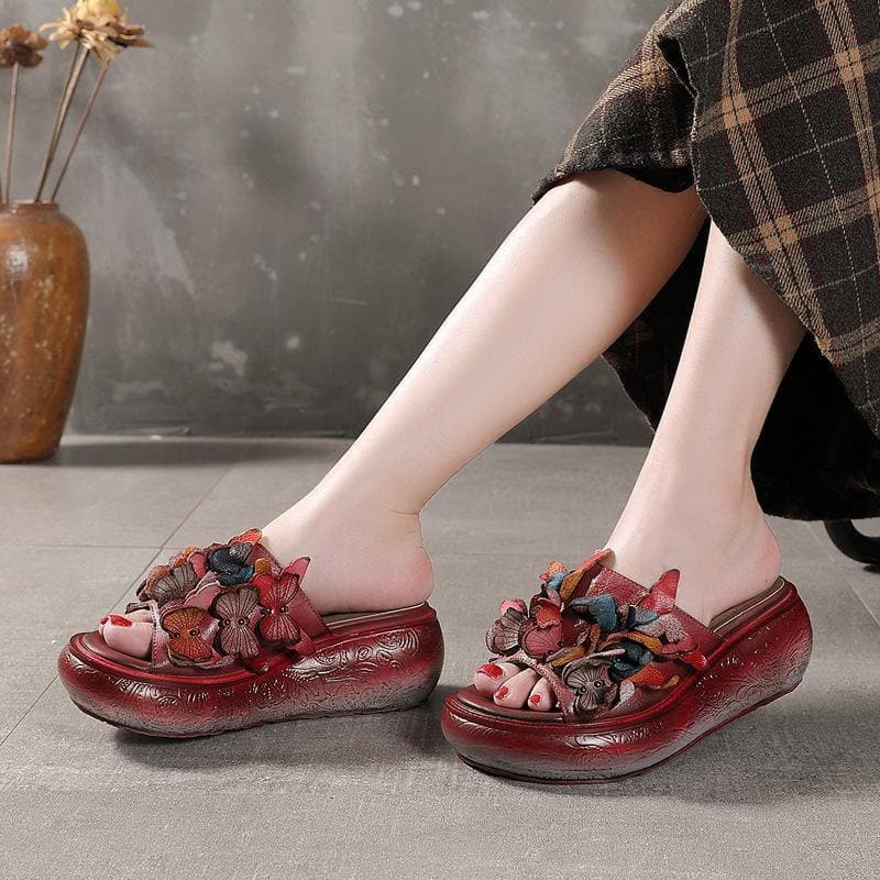 Casual Platform Red Cowhide Leather Peep Toe Slide Sandals