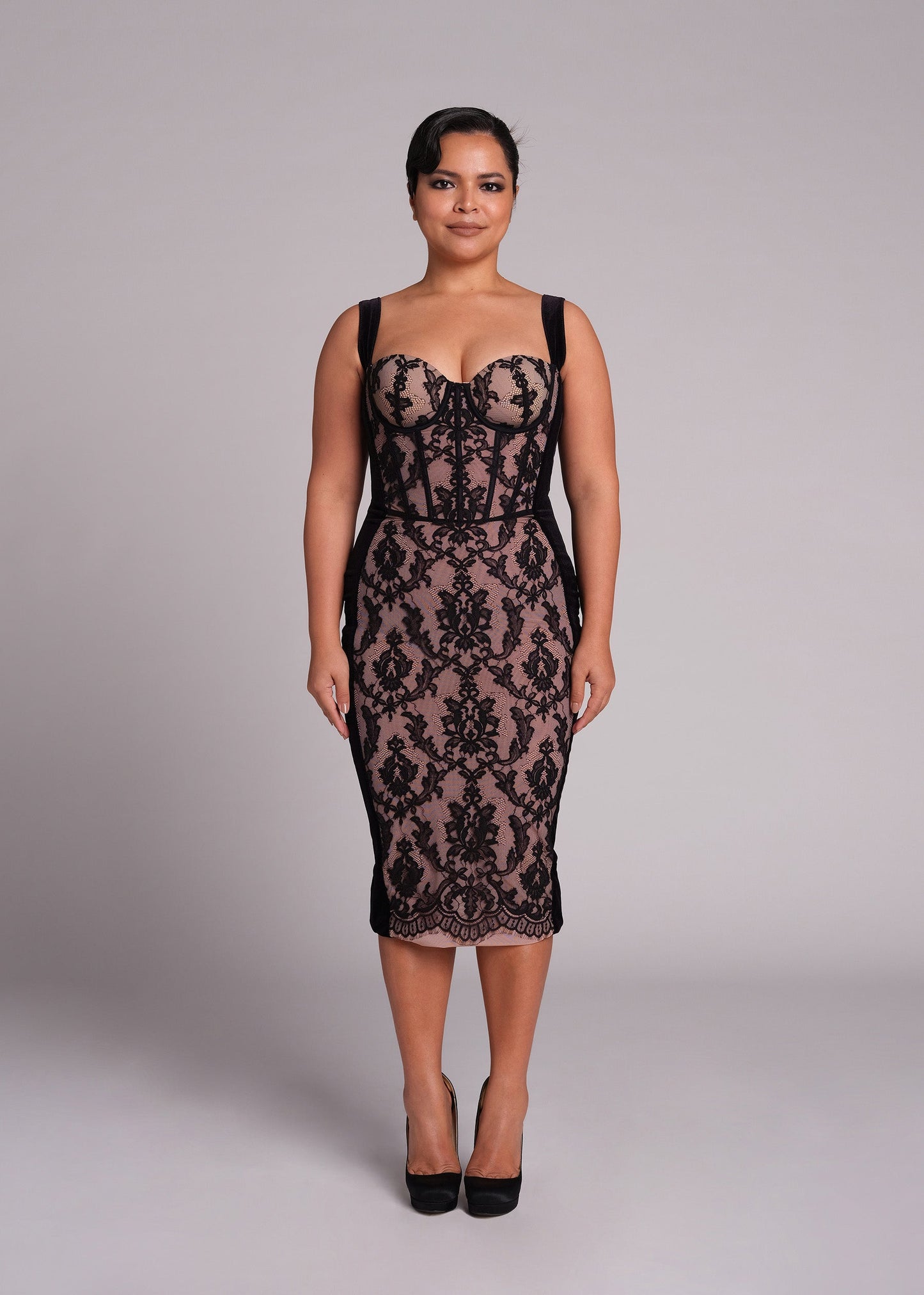 Crafted with a unique blend of Bandage and Lace fabrics, this dress boasts a distinctive texture that's as comfortable as it is stylish. The Bandage fabric provides a figure-hugging fit that accentuates your curves, while the delicate Lace detailing adds a touch of sophistication.