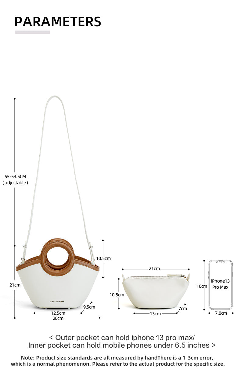 Simple and neat scallop silhouette blend holiday style and modern sense custom cow split leather match handle with embossed convex. Three-dimensional and soft Mother-child bag design fully meet capacity needs.