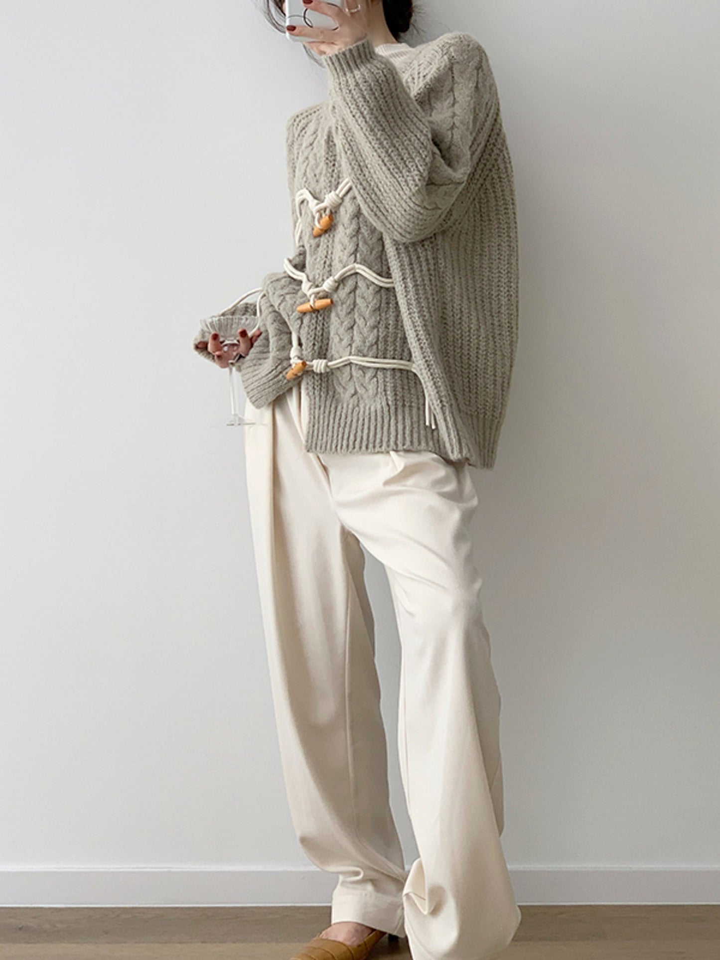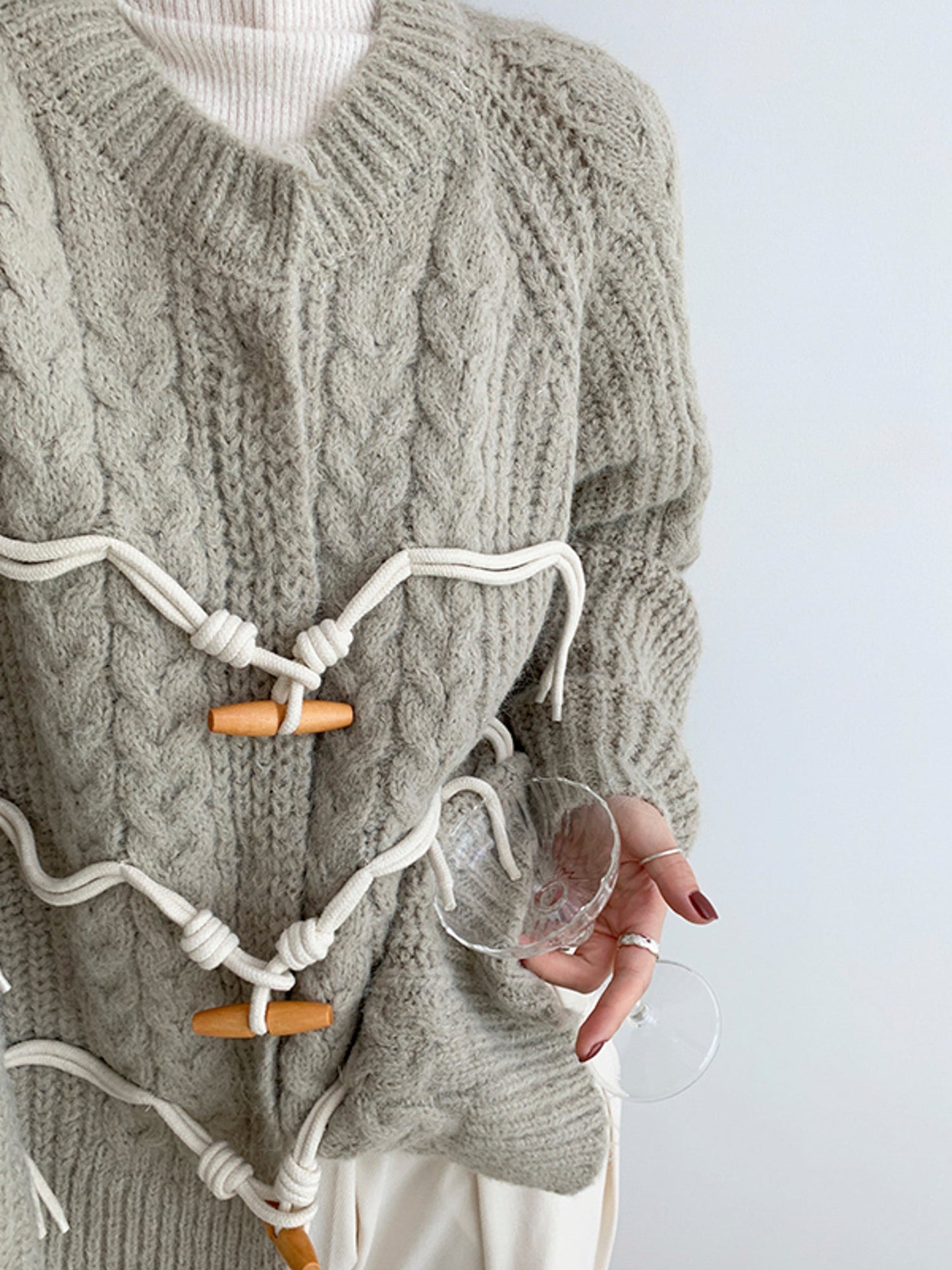 Chunky Knit Horn Button Twisted Cardigan in Grey-Green Tones for Women Autumn Winter Sweater
