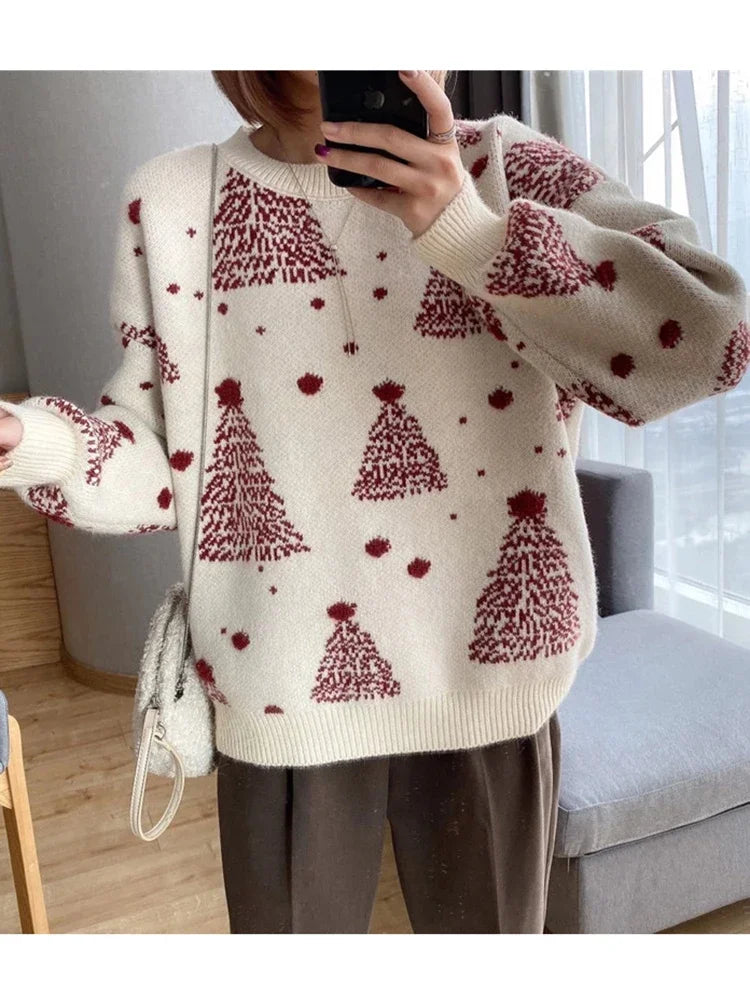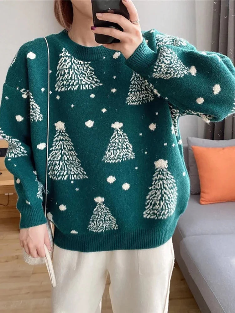 Claudine - Warm knitted sweater with a loose fit and Christmas tree print for women