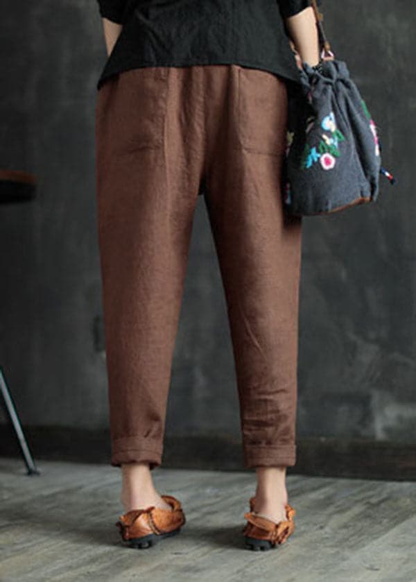 Coffee Solid Pockets Linen Harem Pants Elastic waist Summer