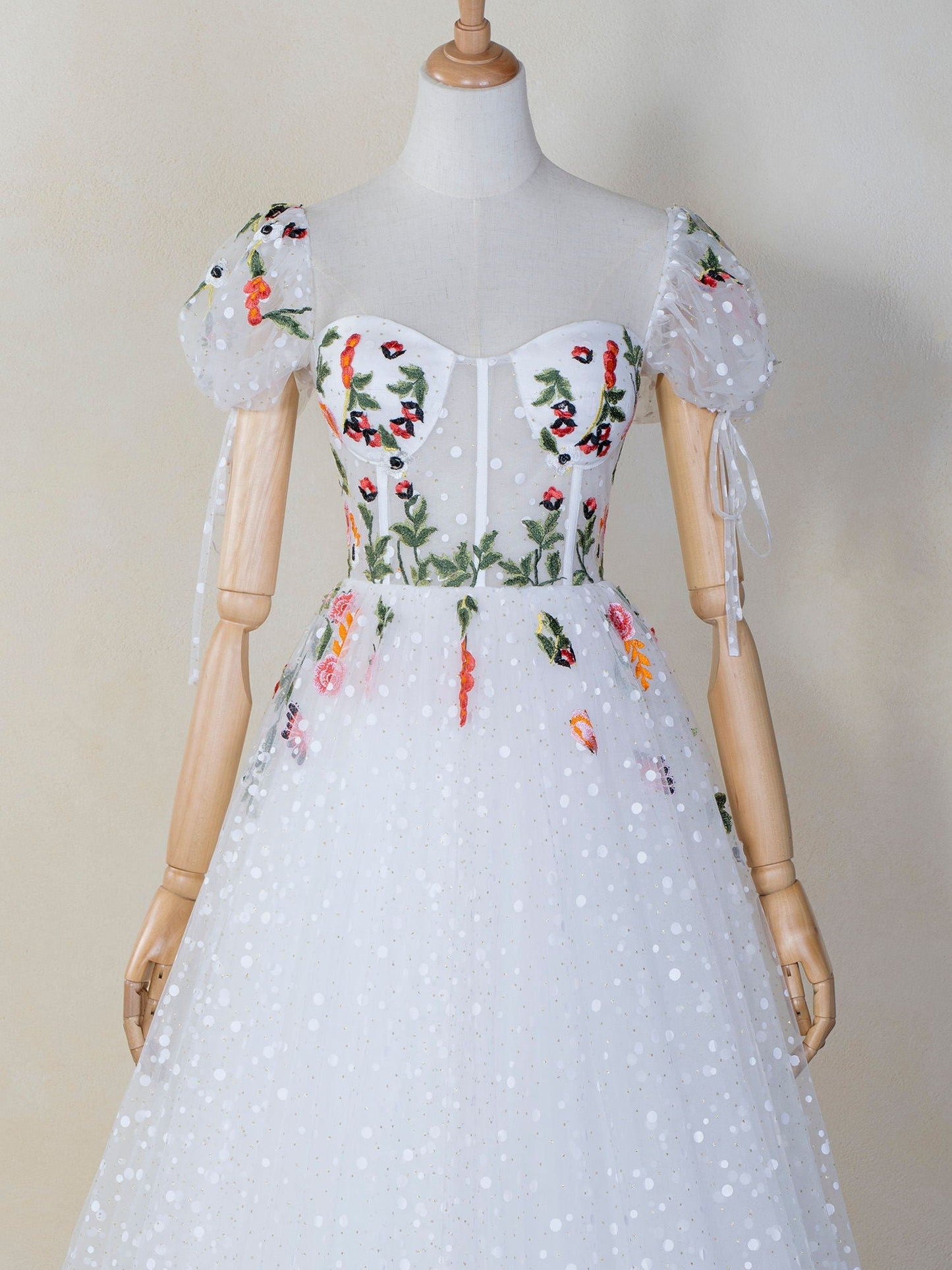 This beautiful white tulle prom dress features a semi-sweetheart neckline and short cap puffy sleeves, adorned with delicate embroidery and dot tulle. The floor-length skirt is perfect for a dramatic entrance, while the fitted illusion corset bodice ensures a flattering silhouette. Enjoy your prom night in style and comfort with this splendid creation from KissProm.