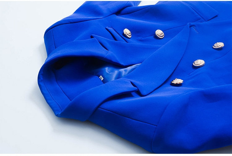 Our Double-breasted Blue Blazer is a must have in your wardrobe. Featuring a double breasted fit with lion golden buttons for extra detail. On the lining. Style with your favorite pants for a chic look! The perfect outfit for the office.