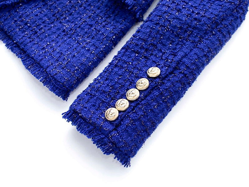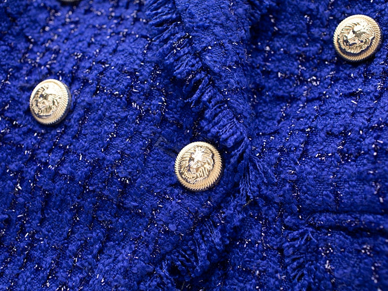 Our Double-breasted Tweed Blue Blazer is a must have in your wardrobe. Featuring a double breasted fit with lion golden buttons for extra detail. On the lining. Style with your favorite pants for a chic look! The perfect outfit for the office.