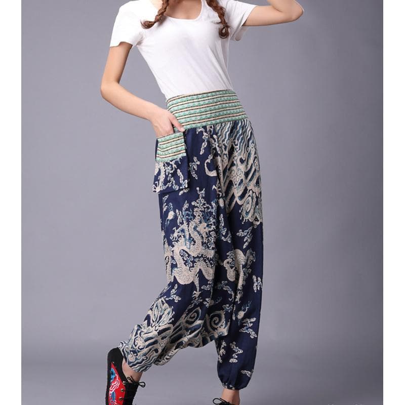 Bring an Asian flair to your day while wearing our Dragon Harem Pants. These boldly printed harem pants offer a cool cultured look that is made comfortable and cozy with its loose fit, elastic waist, and cotton blend material. The Oriental detailing has an artistic touch that stands out and is beautiful to the eye. It is made even more interesting with its single pocket and patterned waistband. Harem pants are ideal for dancing and for mornings at the gym but these dragon harem pants will take your active days to another level!
