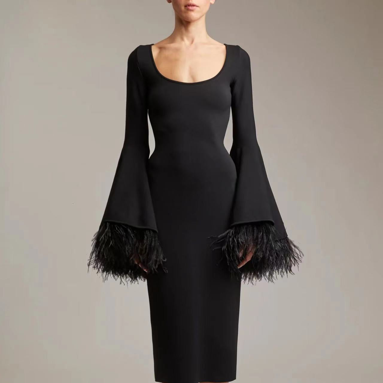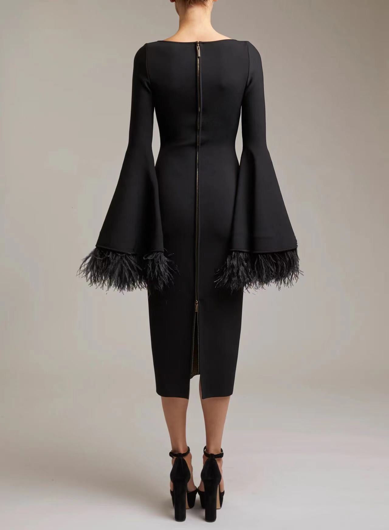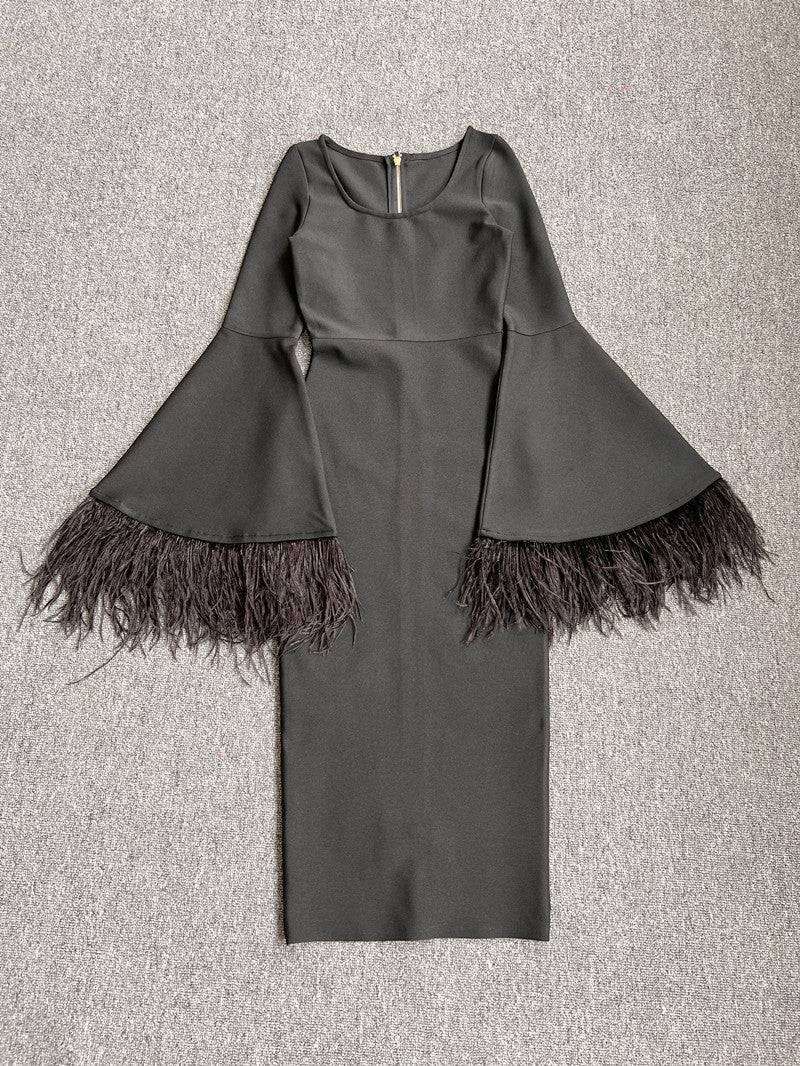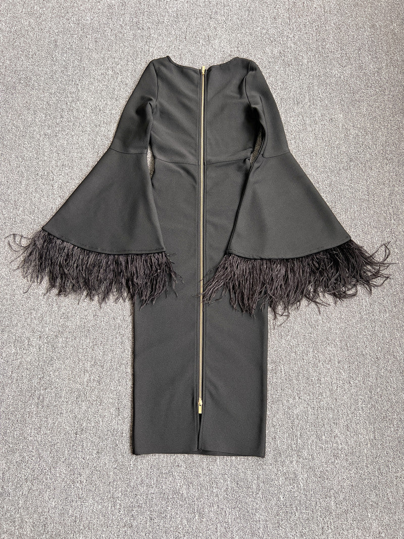 The bandage fabric adds a unique texture to the dress, while the feather decoration gives it a touch of elegance and glamour. Available in classic black color, this dress is perfect for prom parties or any formal event. It comes in sizes S-L to ensure a perfect fit for everyone.
