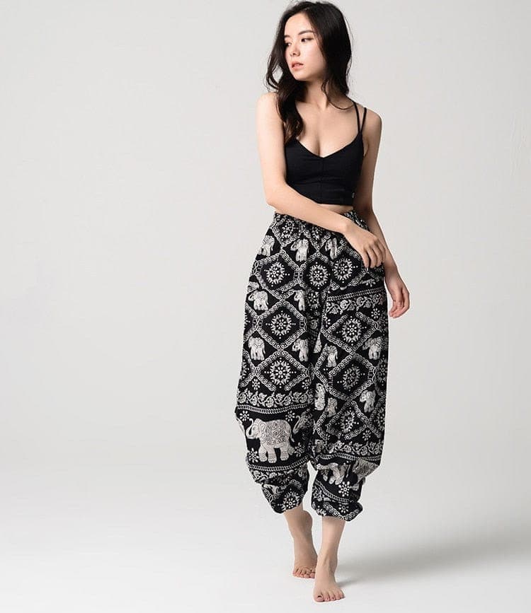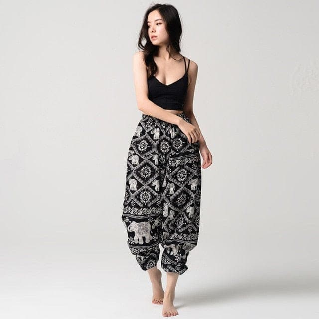 Look culturally inspired in the tribal print of our Elephant Print Boho Harem Pants. The intricate detailing of these harem pants gives them a fun personality that will spark conversation wherever you wear them. Their elastic waist and loose harem fit make them ideal for active days at the gym or yoga class when you want to feel capable and relaxed. Wear them with sandals and a tight-fitting tank top or sports bra to create a fun and sporty look.
