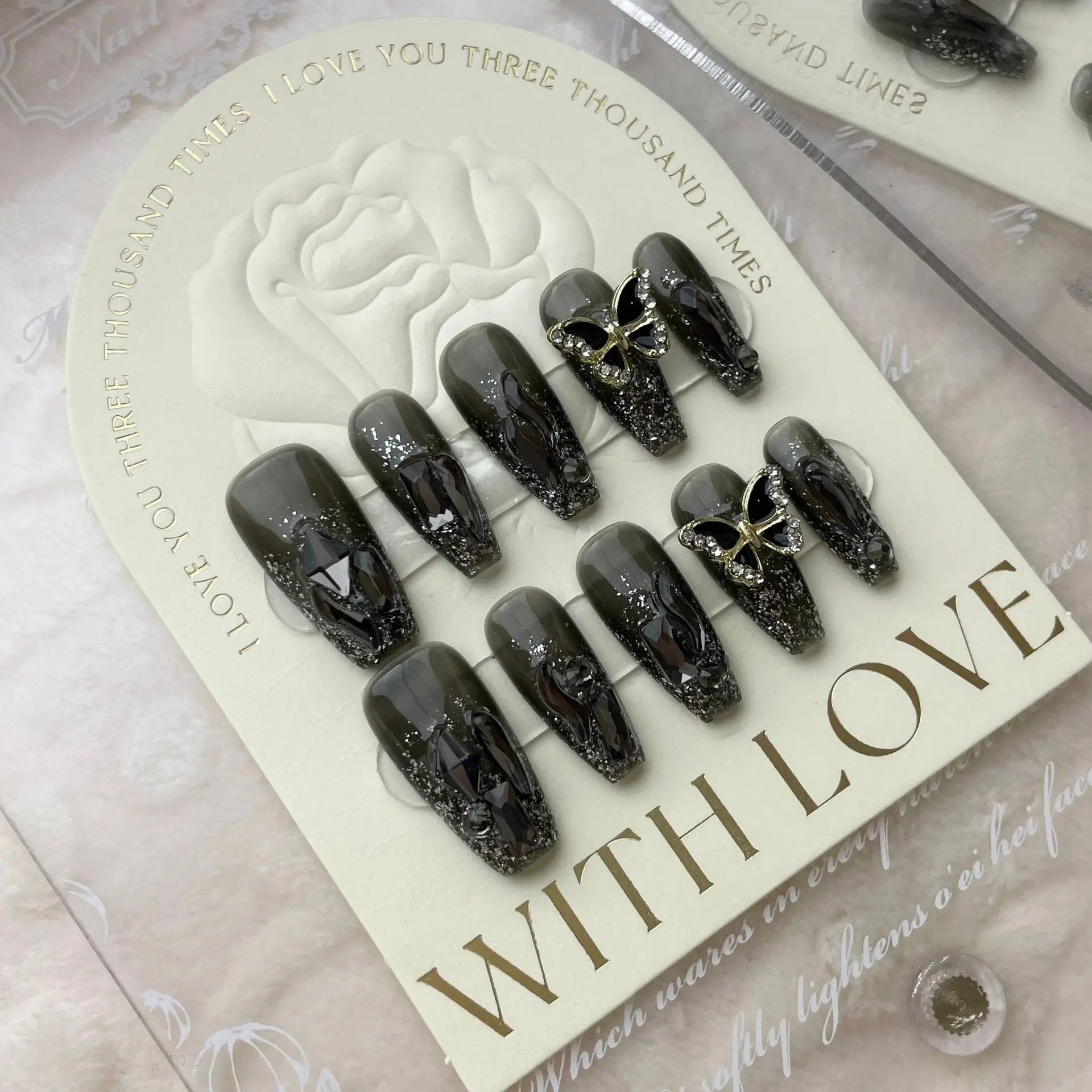 False nails, black handmade rhinestone nail, butterfly design, beautiful women's artificial wearing nails, reusable