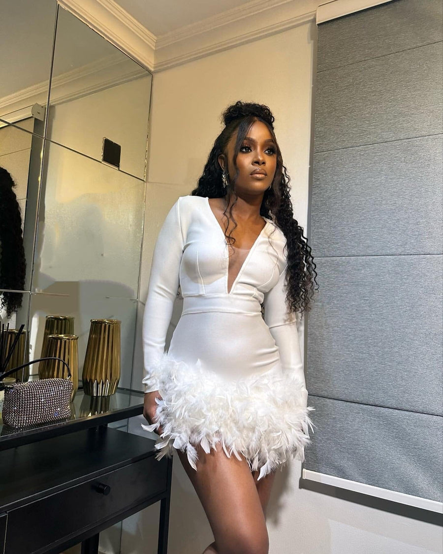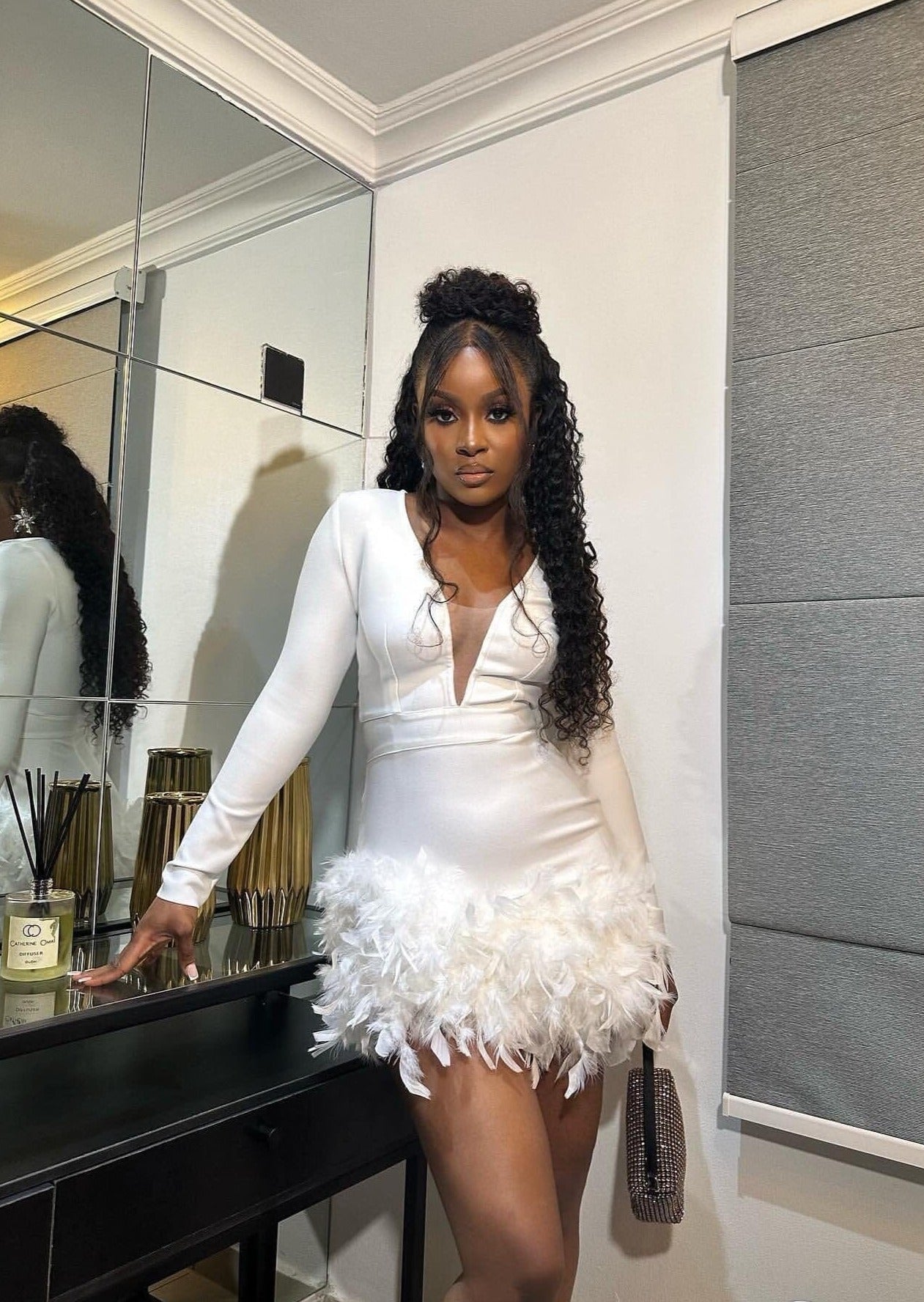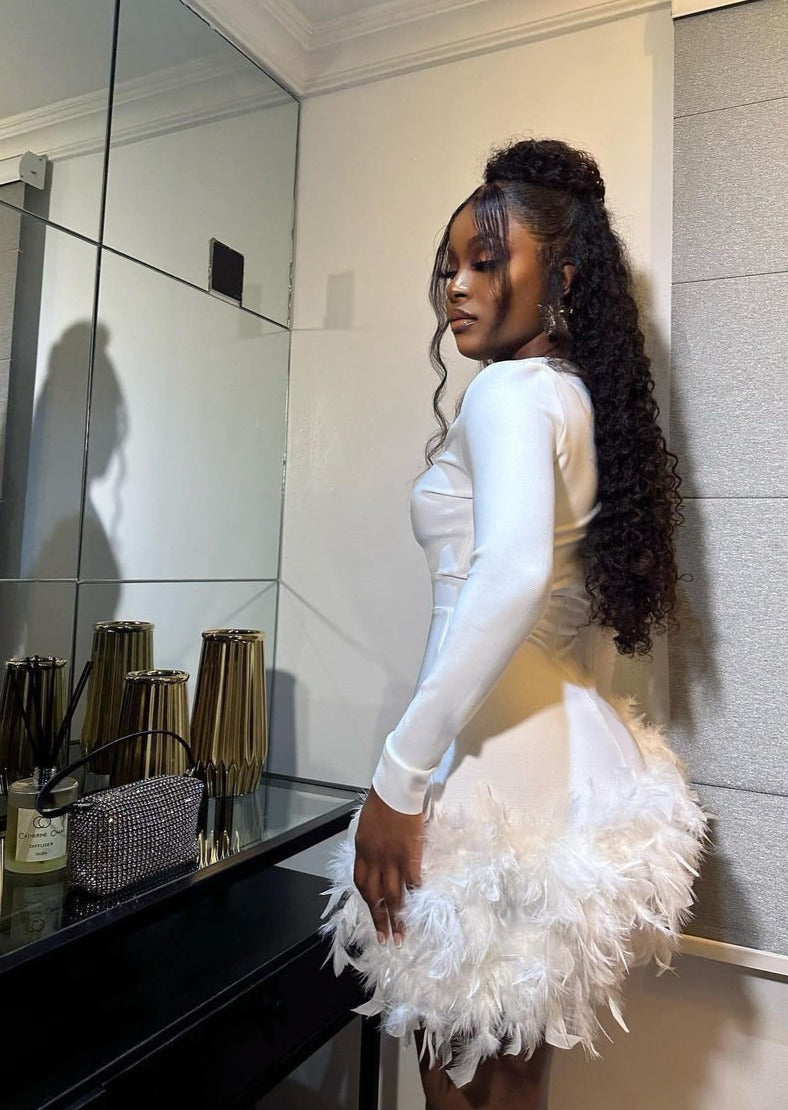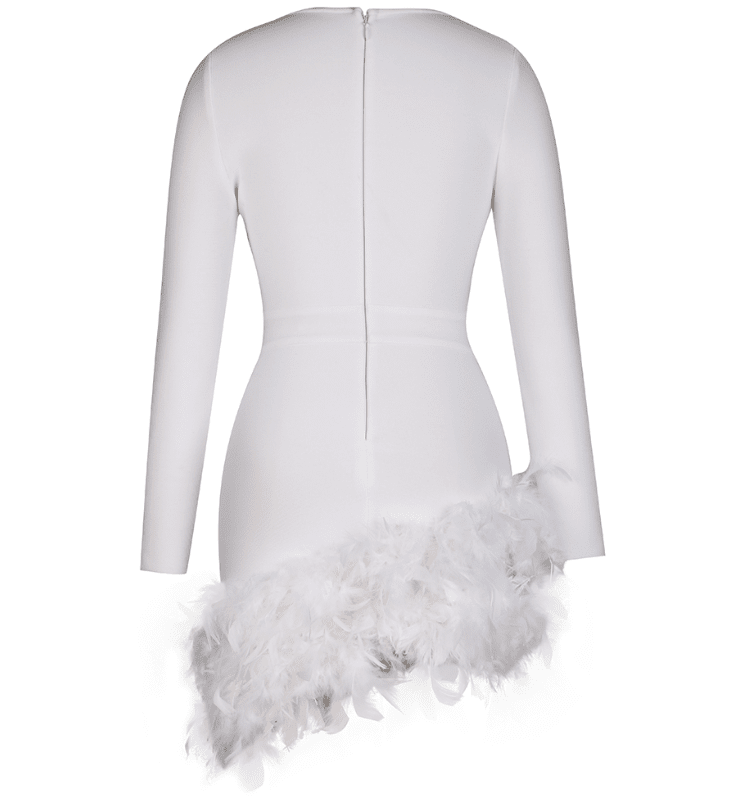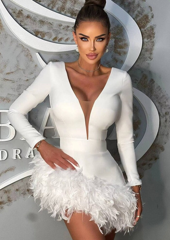 Ready to ruffle some feathers? A plunging neckline with mesh detail and flirty feather asymmetric hemline. Pairs well with heels and perfect outfit for a night out and dancing.