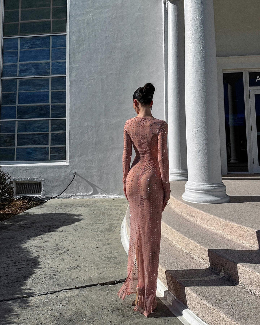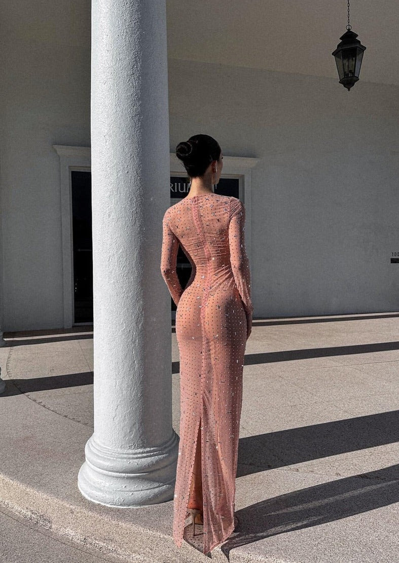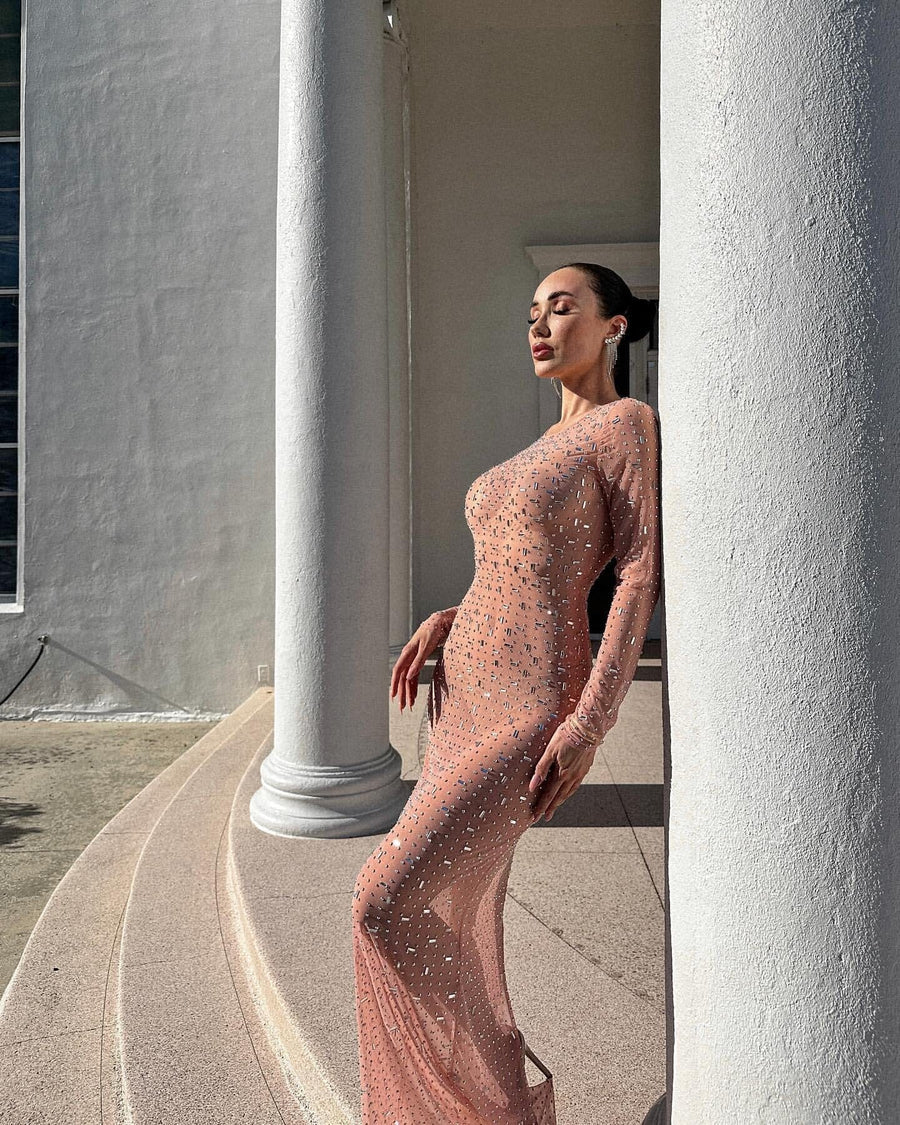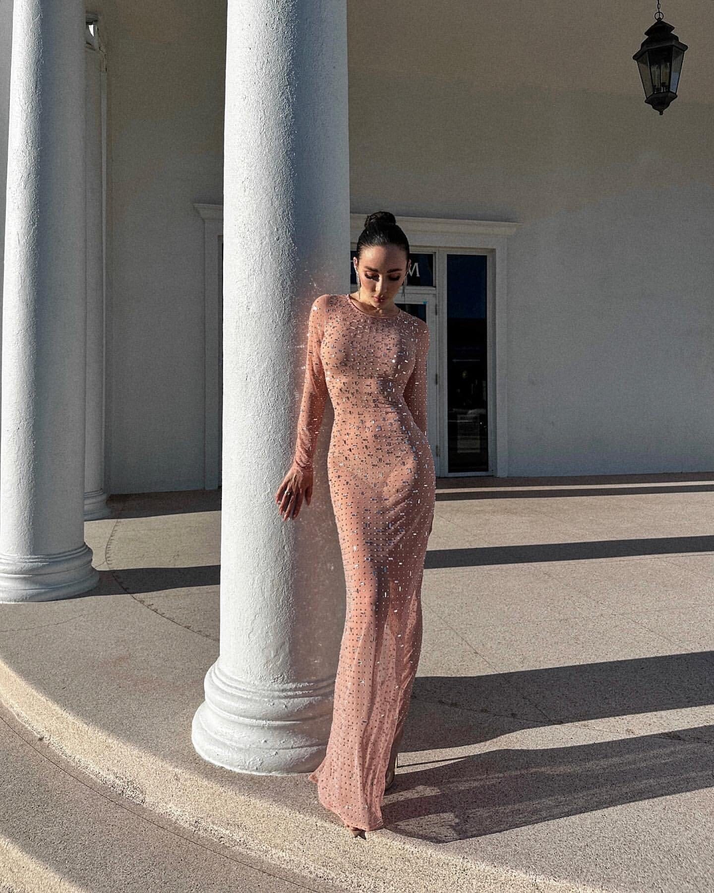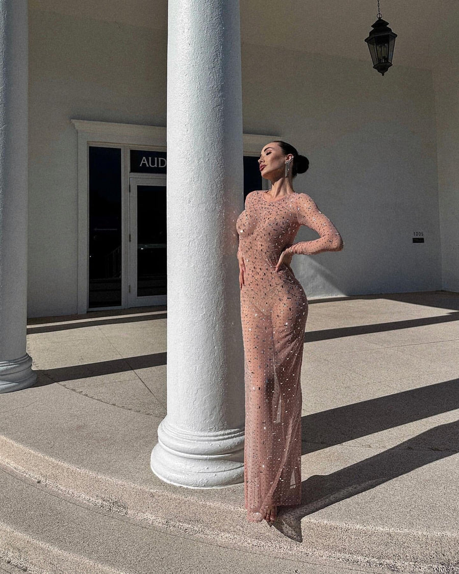 Get ready to wow in our Glitzy Beige Maxi Dress. This gorgeous show-stopping dress features full sleeves in a see through fabric. Add some heels and minimal accessories for the perfect look!