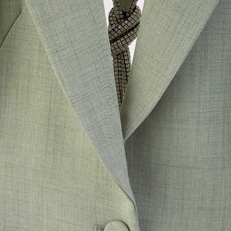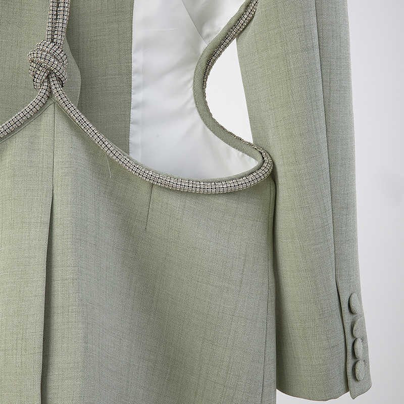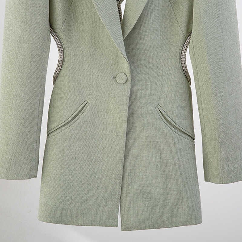 Look all kinds of glam in this unreal Green Backless Diamond Blazer. Featuring a lapel collar, backless design, with diamond detailing and hollow out sides, we're in love. Wear with black biker shorts underneath, a statement bag, and finish it off the look by pairing it with satin diamond heels. You can't forget your earrings to pull everything together as featured.