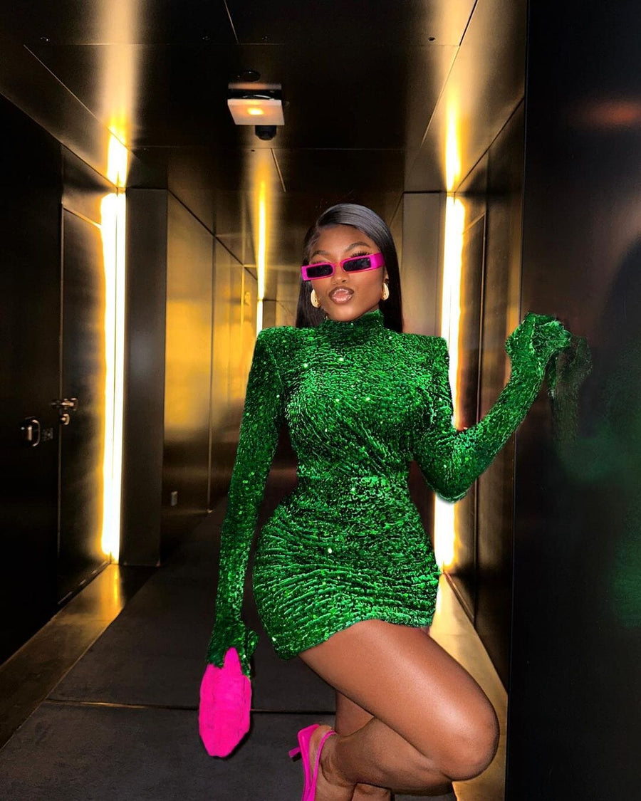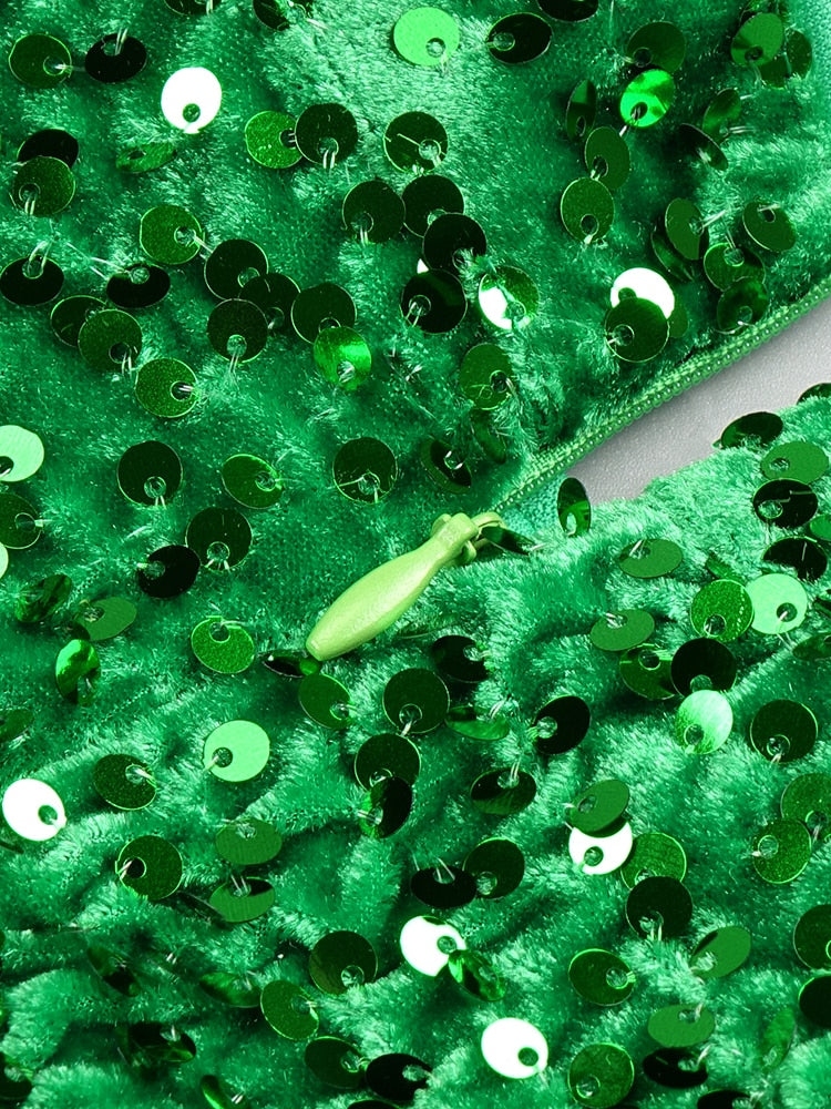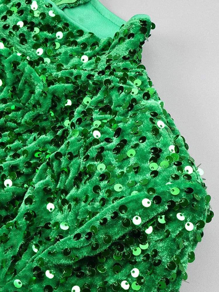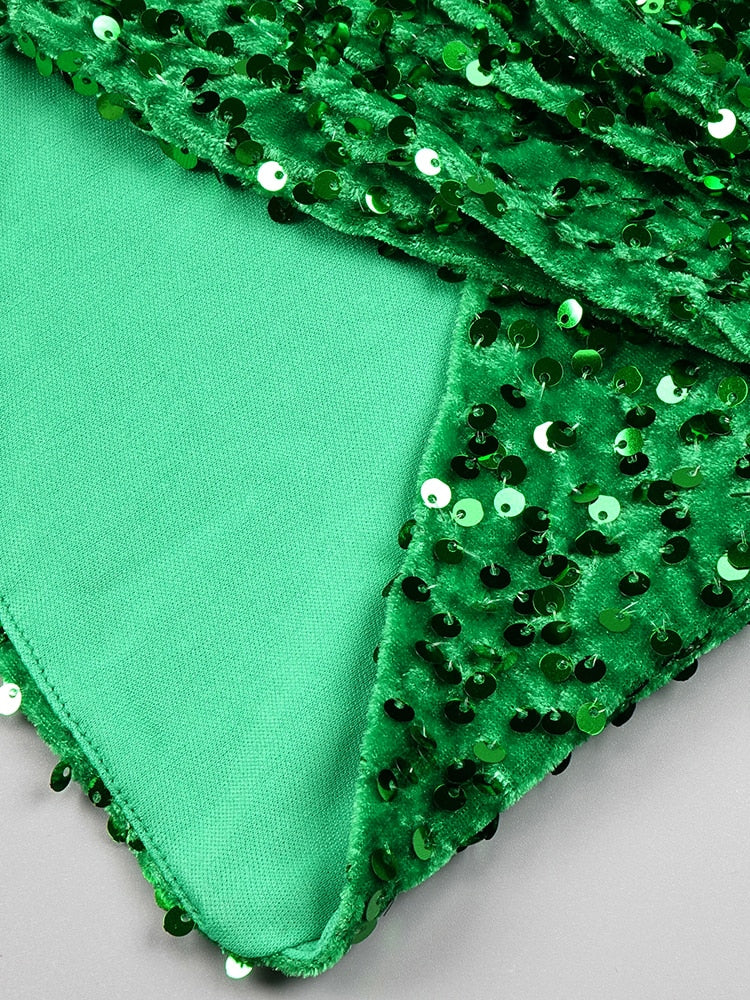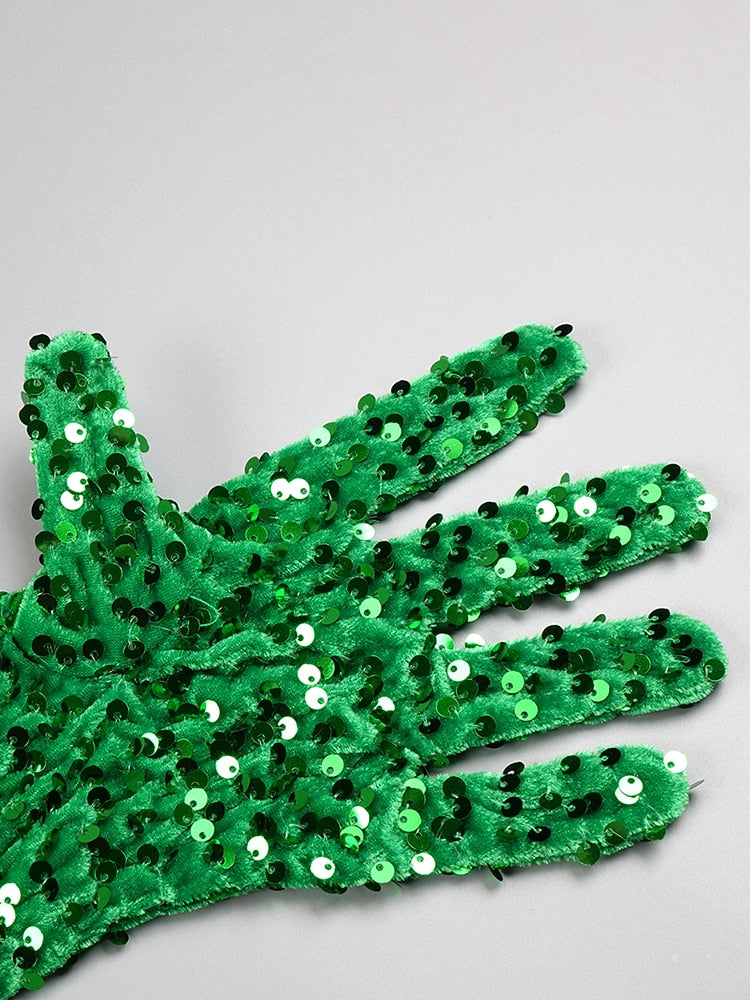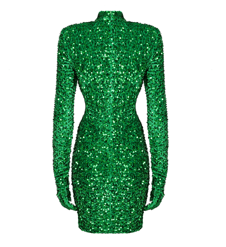 The Sequined Green Mini Dress with Long Glove Sleeves is nothing but elegance and glamour! Featuring a high neckline and long sleeves with gloves in a fun glitter fabric. You will be the center of attention with our dress! Style with heels and pulled back hairstyle.