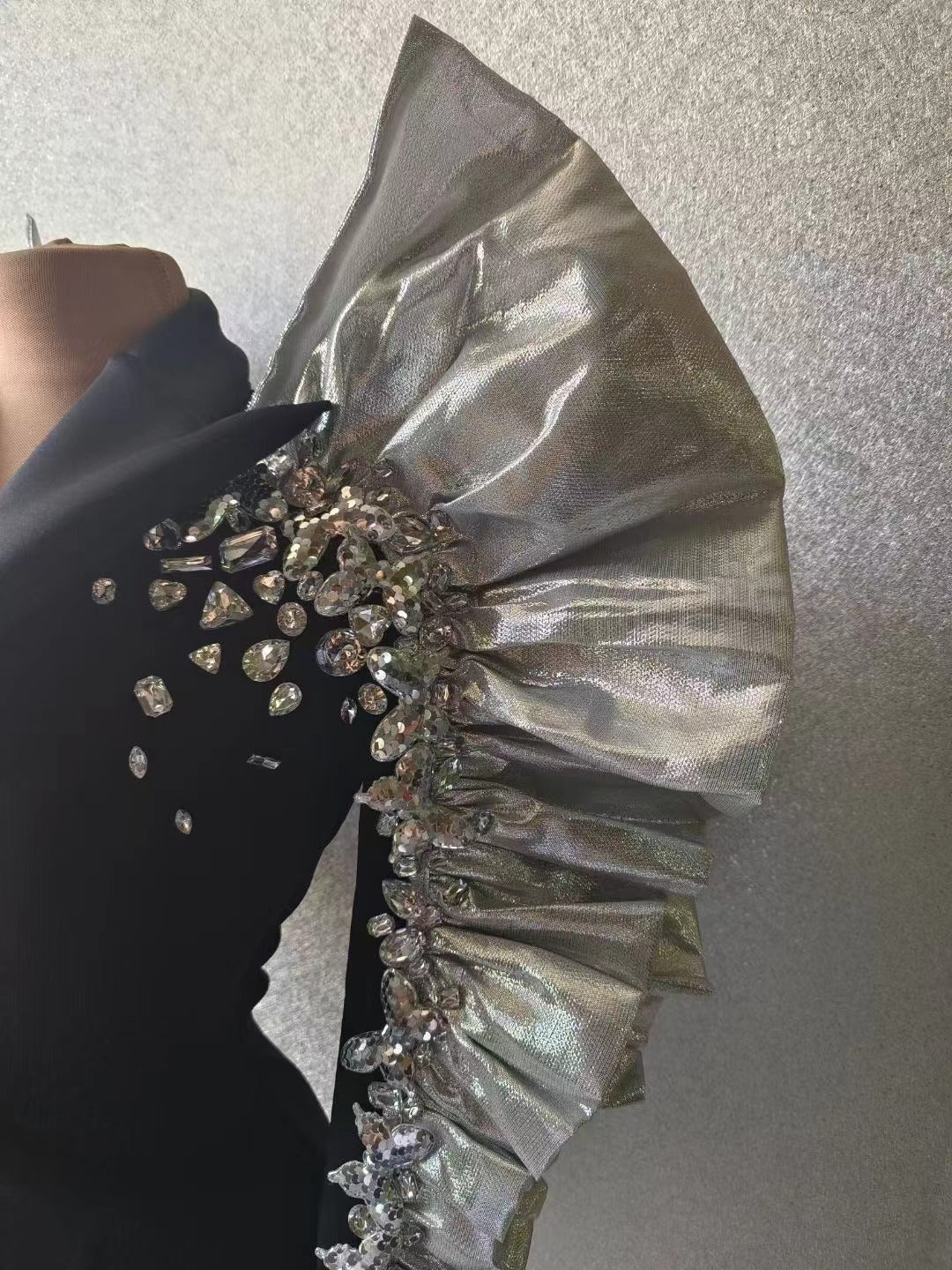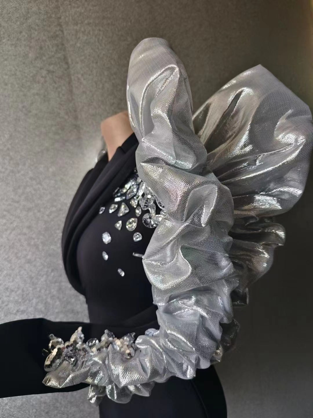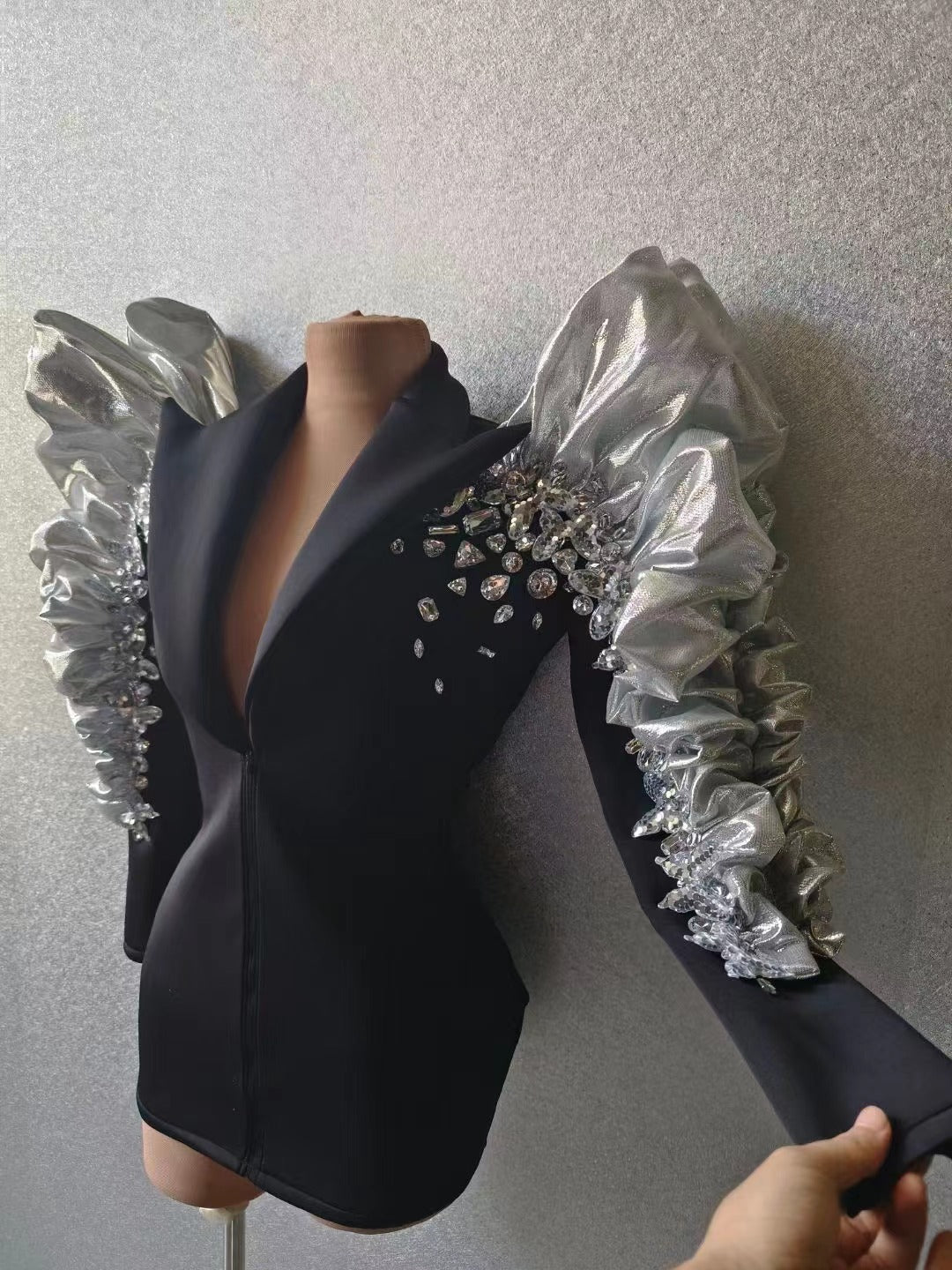 Elevate your stage presence with our Handmade Crystal Concert Performance Coat. a breathtaking blend of style and sustainability. This remarkable blazer-style jacket is designed for women who demand excellence in every aspect of their performance attire.