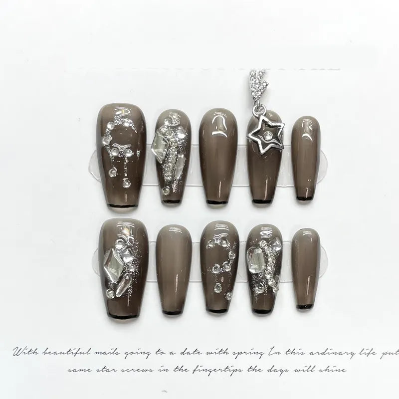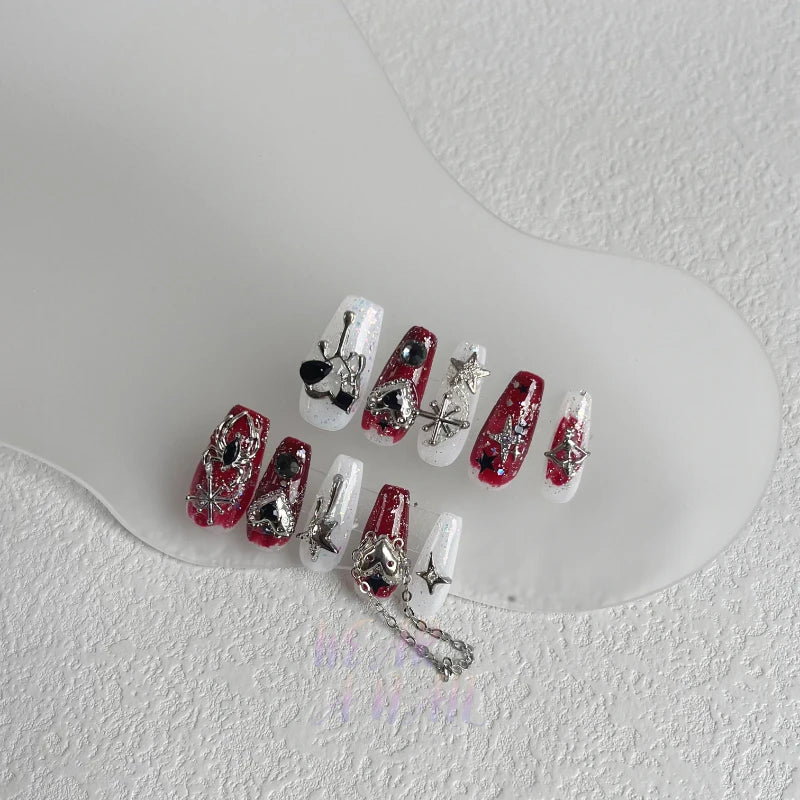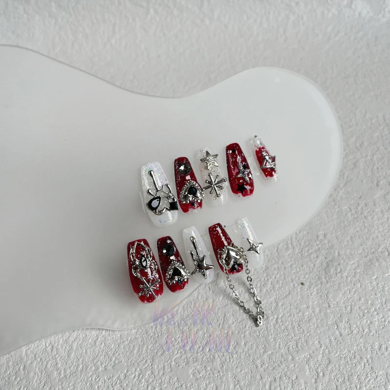 Handmade Press on Nails Black Dark Gothic Wearable False Nails Rhinestones Demon Decoration Reusable Charm Acrylic Nail Tips
