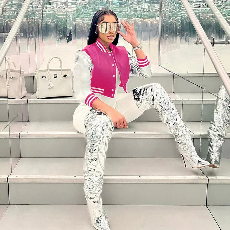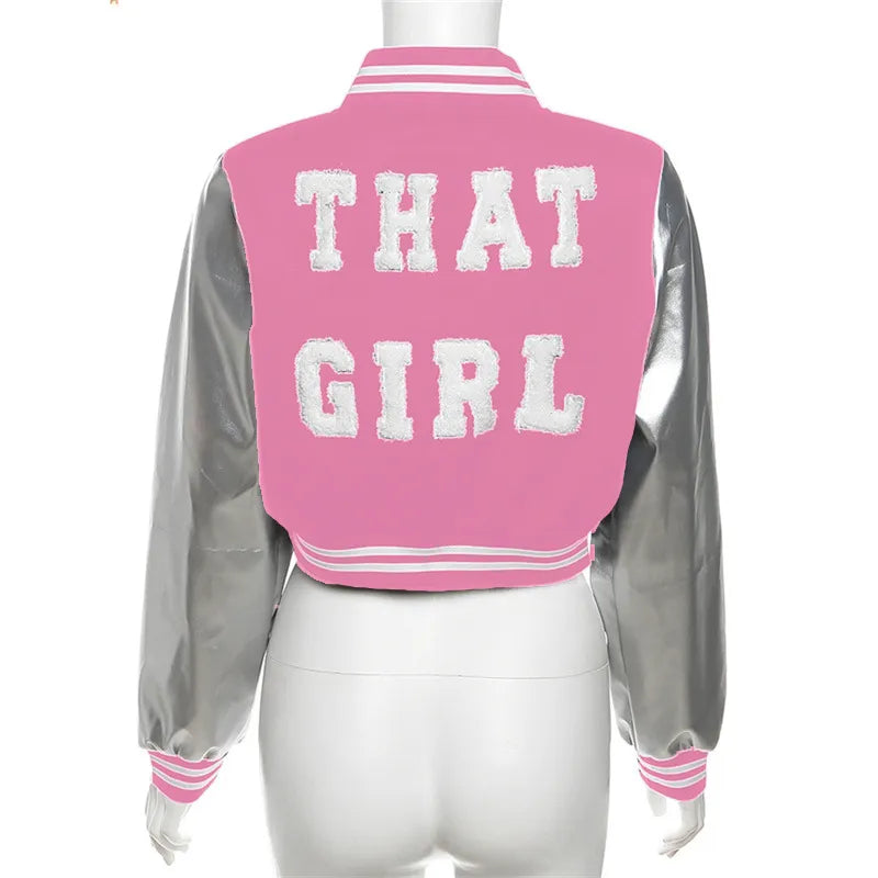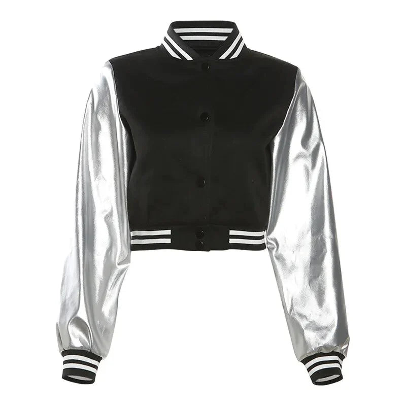 Introducing our Hipster Patchwork Varsity Jacket - the epitome of casual streetwear fashion for the Autumn and Winter seasons. This crop top long sleeve patchwork coat in black combines the edginess of a baseball varsity jacket with a touch of hipster style. making it the perfect addition to your wardrobe.