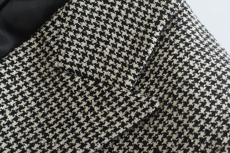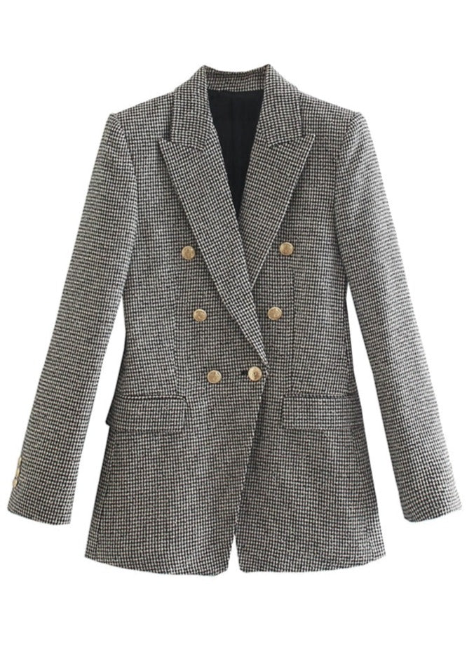 A fitted long-sleeved Houndstooth Double Breasted Blazer is an elegant statement piece for your wardrobe. Side flap pockets, gold buttons add a touch of sexy. We like to team this beautiful piece with jeans tucked into knee-high boots.