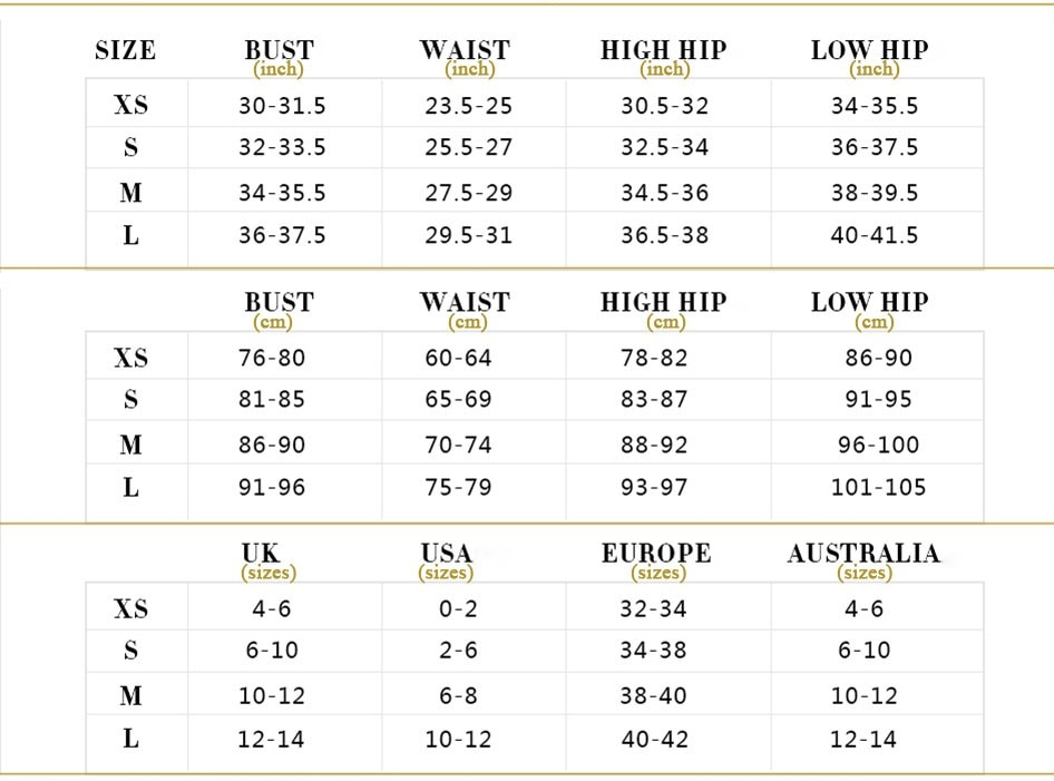 SIZE | BUST (inch) | WAIST (inch) | HIGH HIP (inch) | LOW HIP (inch) |