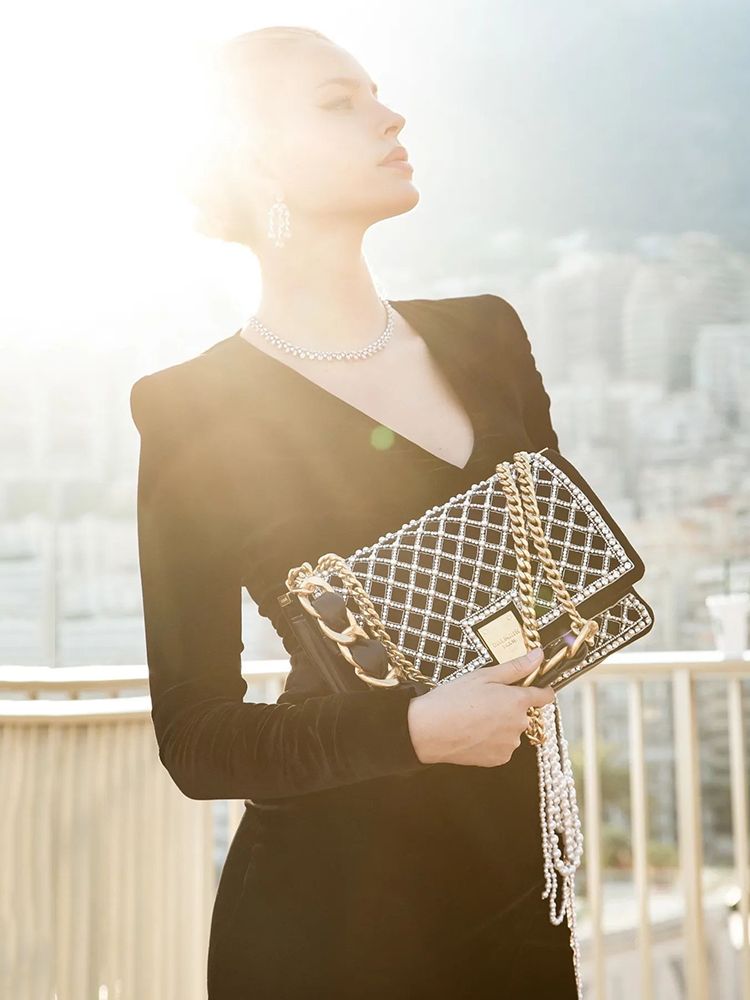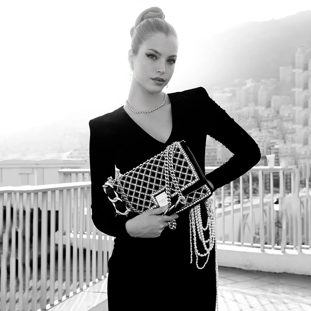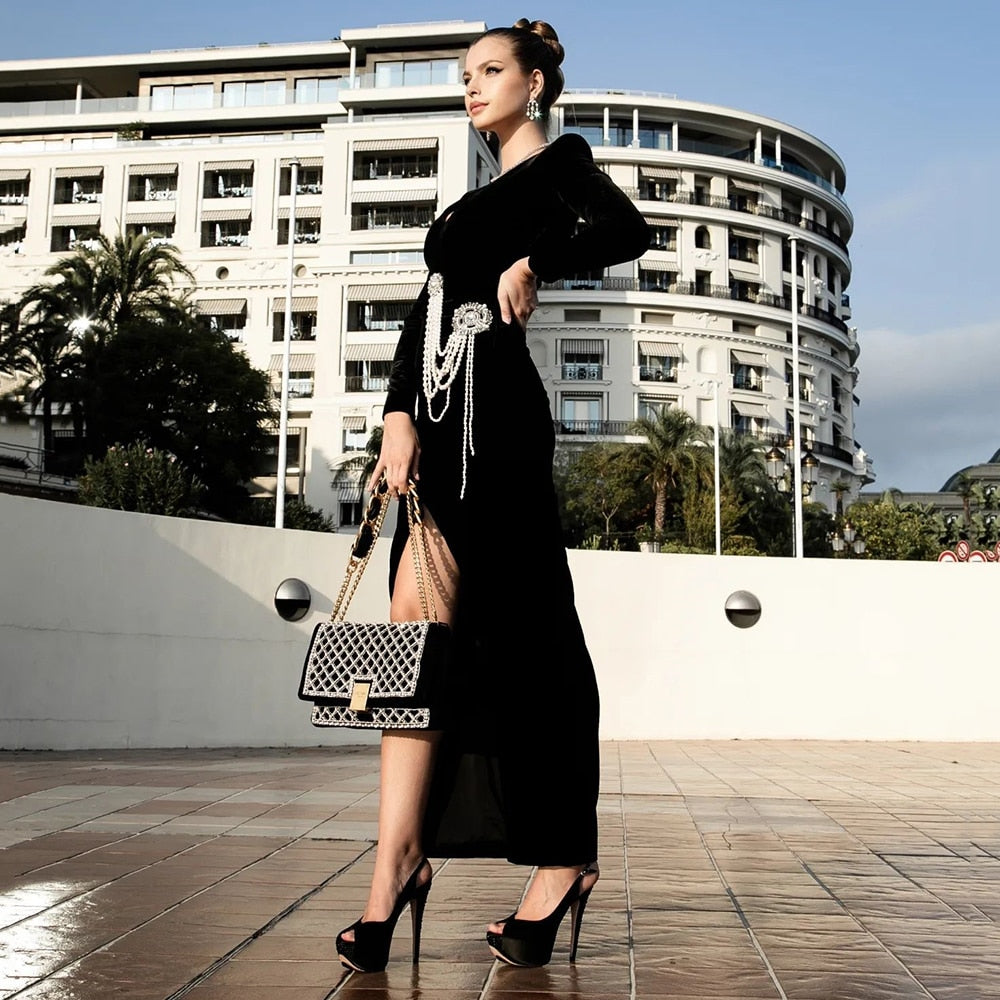 Women's Luxury Bead Chain Design Long Sleeve Celebrity Black Sexy V-Neck Long Bandage Dress Vestidos