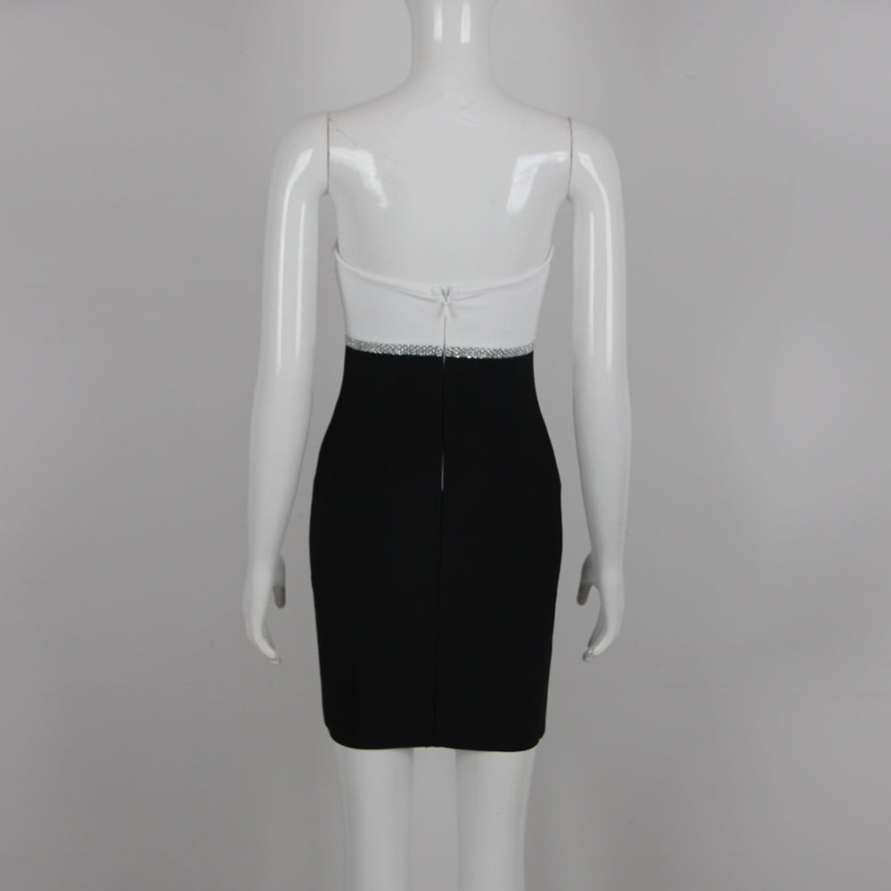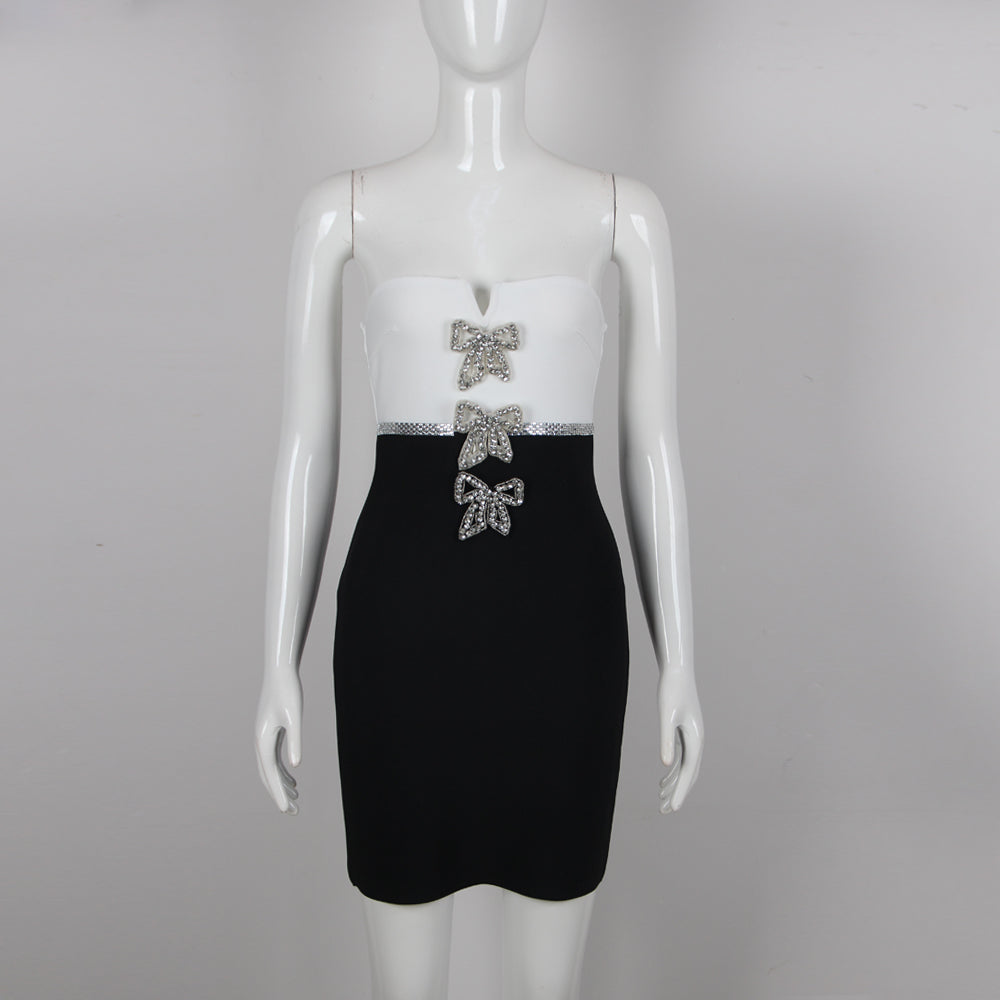 Adding a touch of elegance, this dress features crystal and bow decorations that shimmer and catch the light, further elevating its luxurious appeal. The combination of black and white colors creates a timeless and sophisticated look that exudes class and elegance.